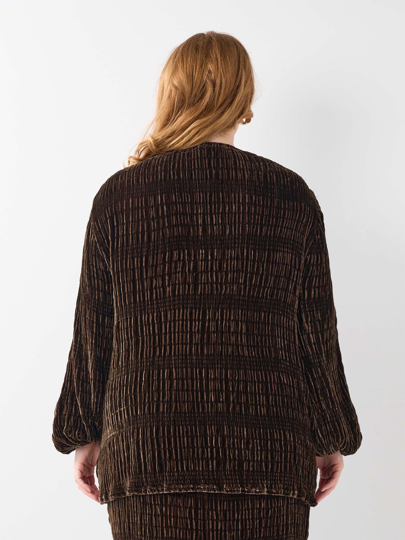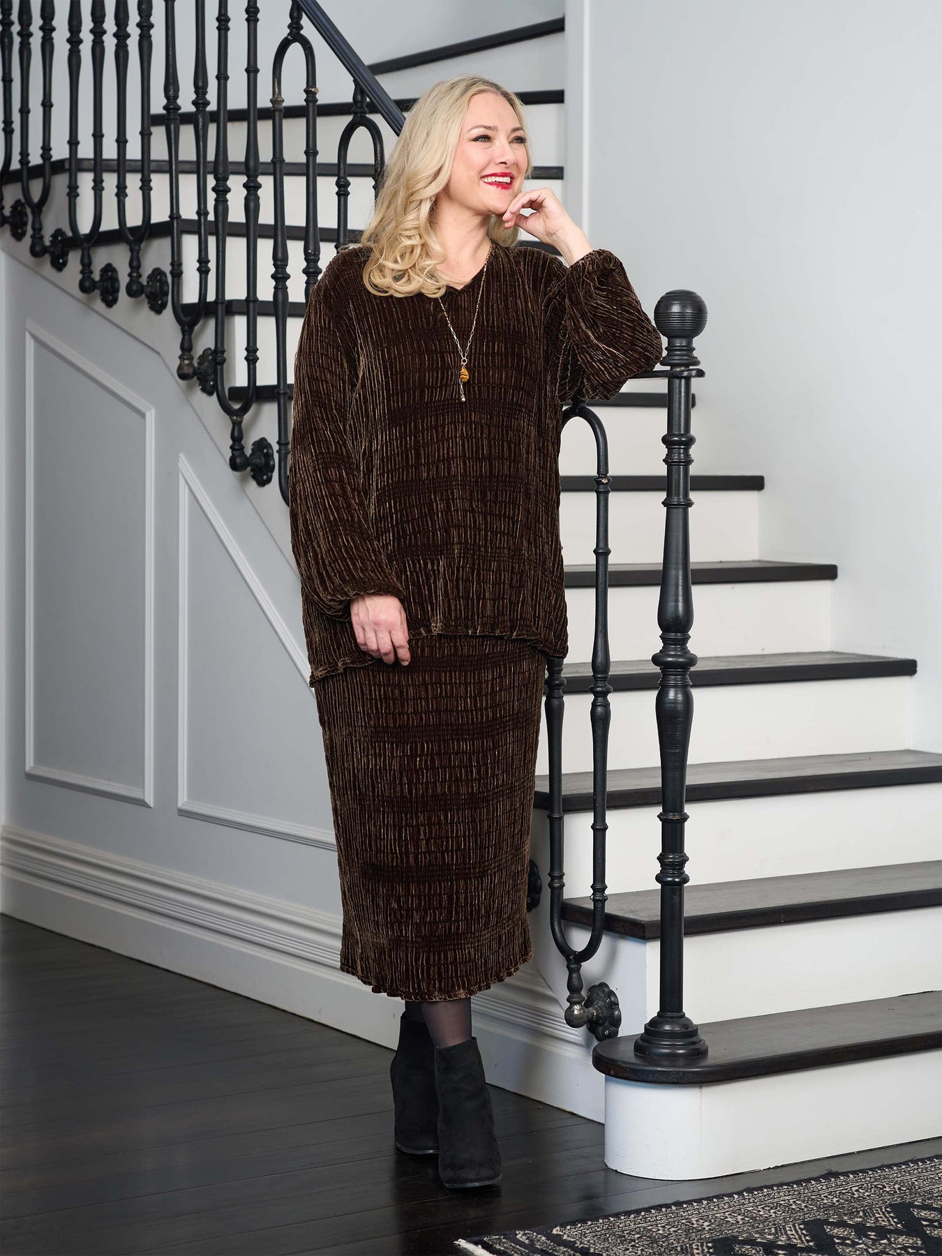 Exuding timeless elegance in deep, rich coffee hues, this plus size evening top is the perfect choice for any special occasion. Whether attending a wedding or an intimate night out, it ensures you look and feel effortlessly sophisticated. Pair it with the matching ruched skirt, style 743005, to complete a truly stunning ensemble.