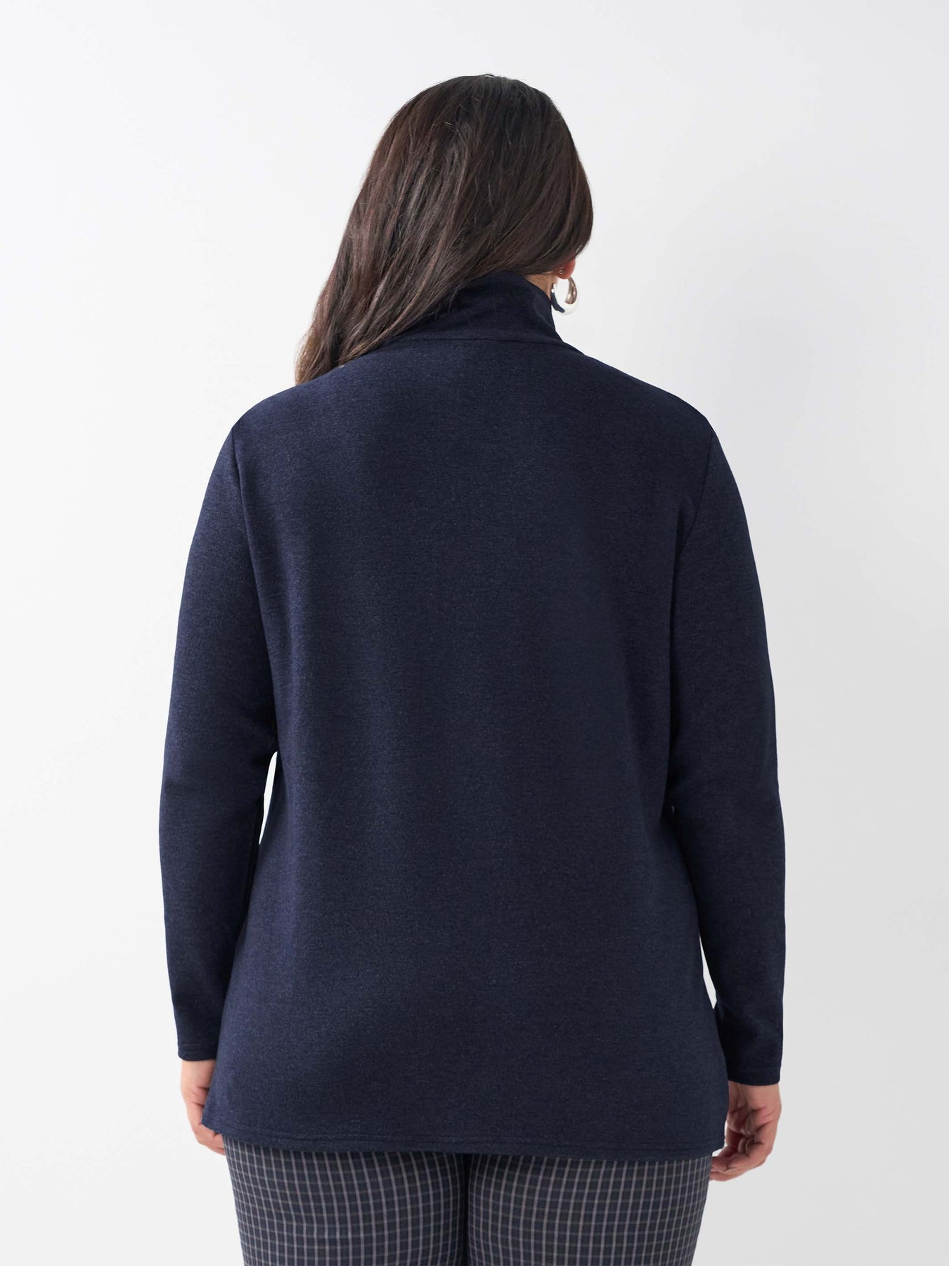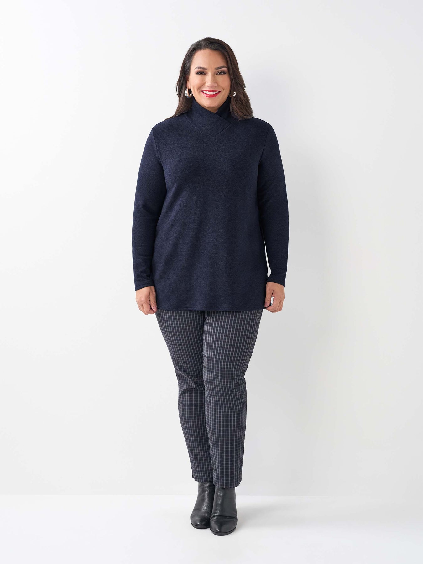 Warm and toasty, this soft plus size top is a timeless, quality choice for winter. Featuring a high crossover neckline for a cosy, snuggly feel, this hip length top is perfect for layering under shorter jackets or wearing on its own.