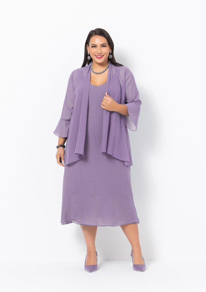 Chiffon chicness meets timeless style. Feminine 3/4 length bell sleeve jacket, sits below the hips and is finished with an edge to edge soft drape close. Marry back with a timeless 1013 georgette dress in royal for a chic and elegant affair. Perfect for weddings.