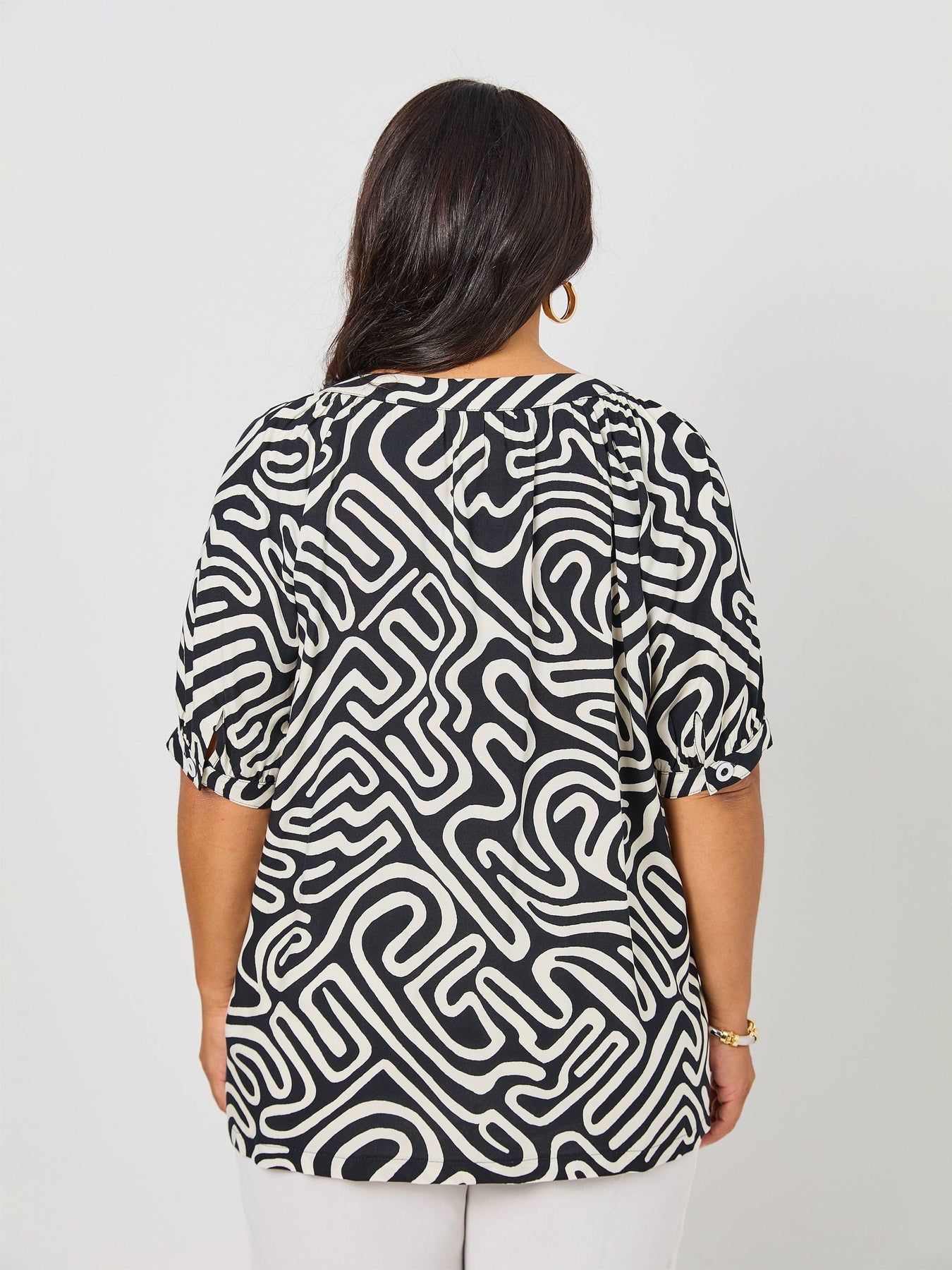 This plus size rayon top offers effortless style with its bold abstract black and ivory swirl print. Crafted from lightweight, breathable rayon, it's designed for comfort and easy movement. A versatile statement piece perfect for workdays or weekends.