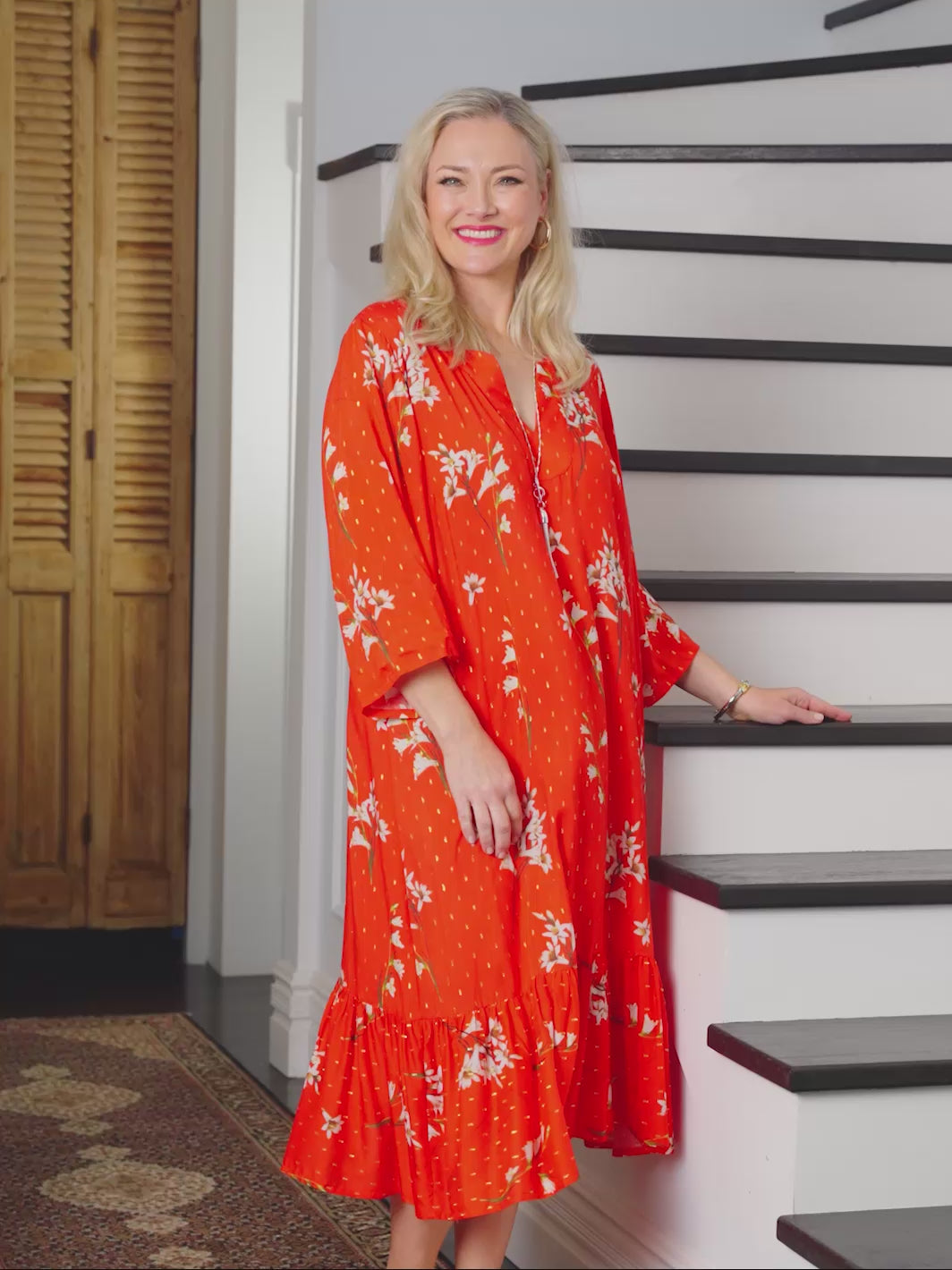 - Details: Christmas red, subtle bell shaped flowers, gold flecks for that perfect touch of shimmer, one tiered ruffle hem line, round neck with V-inset, loose mid forearm length sleeves, non stretch, ample hip room, cool to wear viscose for Christmas Day