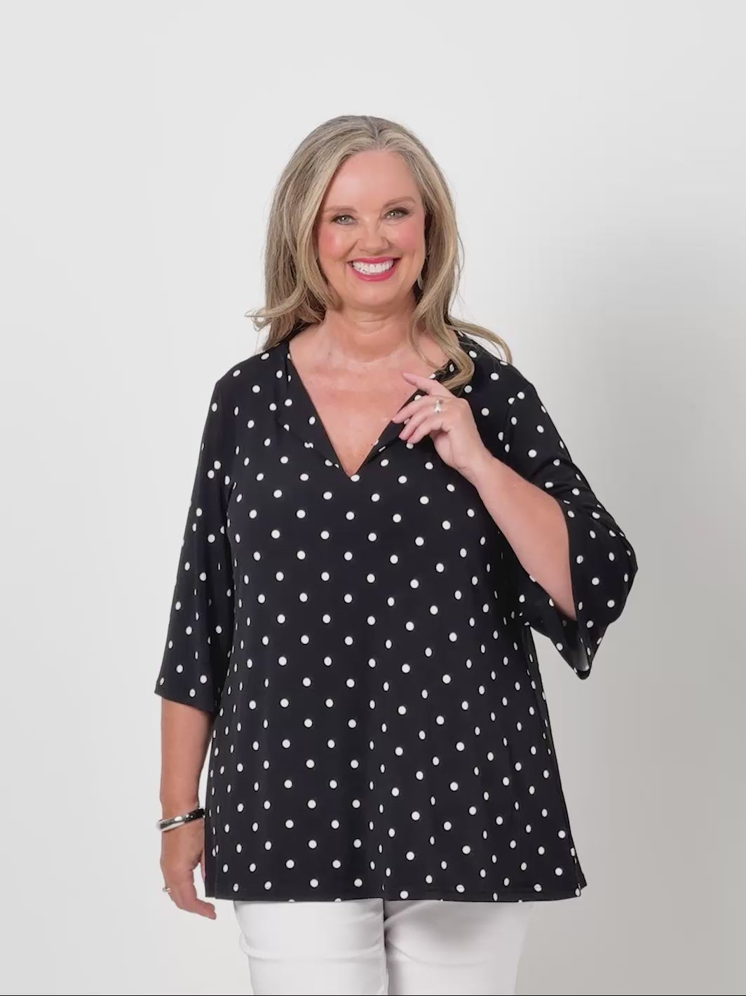 Make an entrance this summer in this striking black and white spot plus size top. Crafted with style and comfort in mind, the stretch jersey offers all-day ease with effortless polish. Featuring a relaxed fit, flattering V-neckline with a turn-back collar, and mid-forearm length sleeves, it’s the perfect choice for race day or simply, timeless summer style.
