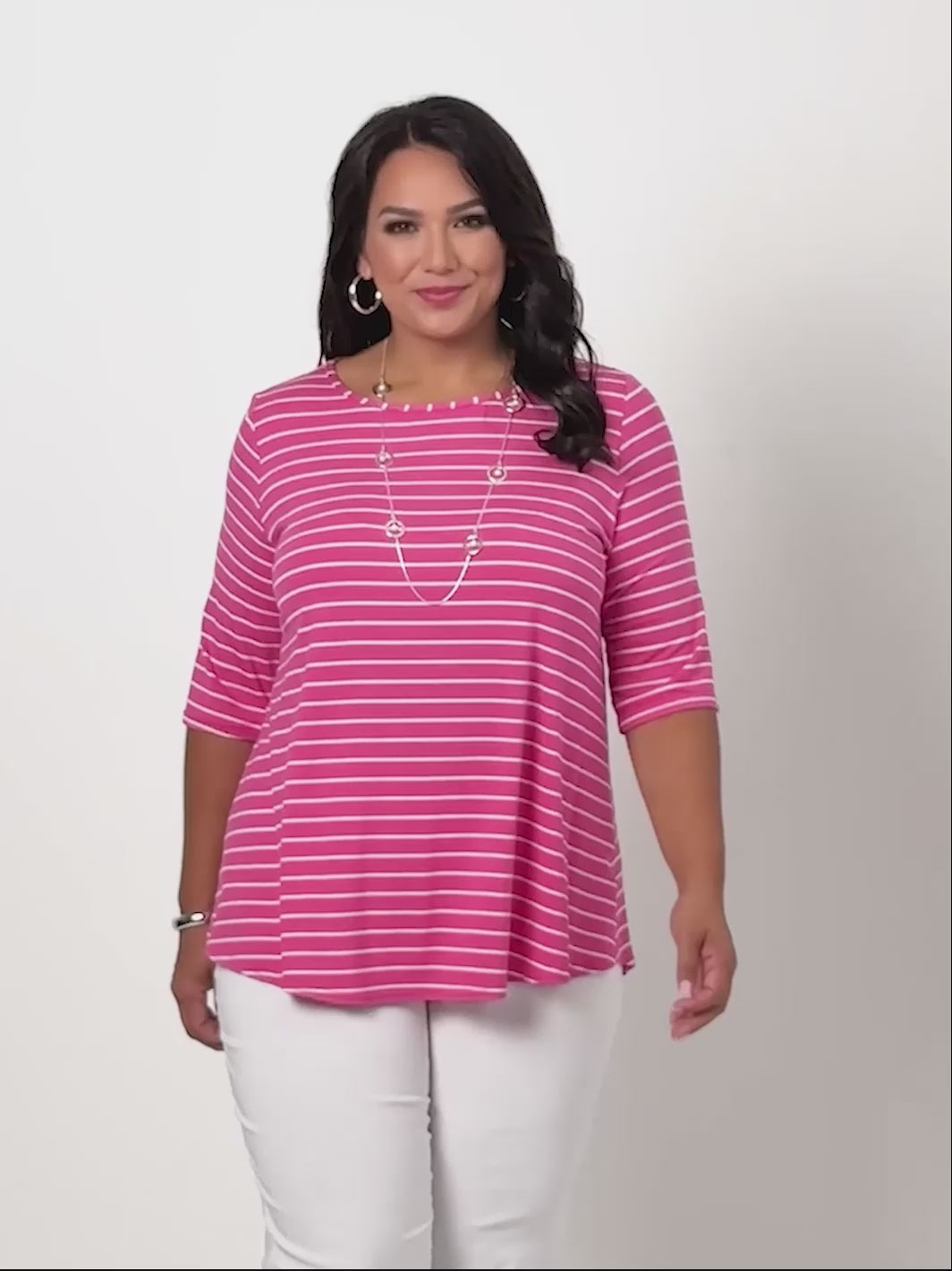 A fresh and summery choice, this plus size striped tee brings together casual comfort and understated elegance. The classic stripe adds a timeless touch, while the relaxed fit ensures all-day ease and versatility. Perfect for weekend outings, lunch with friends, or running errands in style. Pair it with white stretch Bengaline or cotton sateen pants to complete a crisp, effortlessly put-together look that feels as good as it looks.