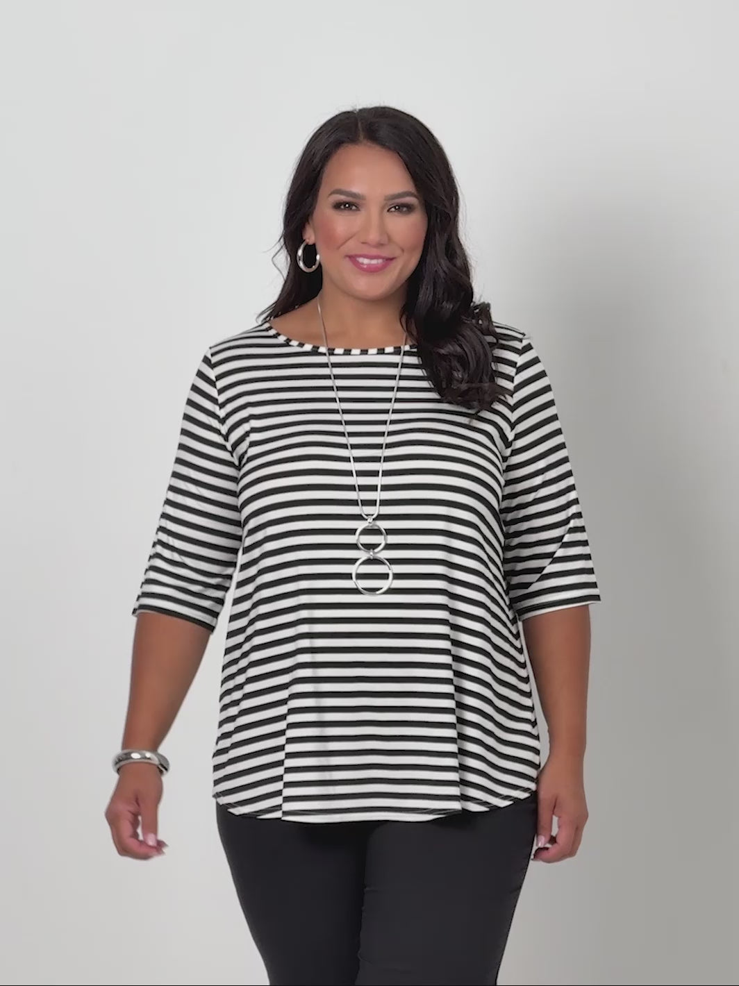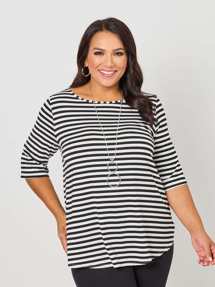 Always a fresh and summery choice, this plus size striped tee brings together casual comfort and understated elegance. The classic stripe adds a timeless touch, while the relaxed fit ensures all-day ease and versatility. Perfect for weekend outings, lunch with friends, or running errands in style. Pair it with white stretch Bengaline or cotton sateen pants to complete a crisp, effortlessly put-together look that feels as good as it looks.