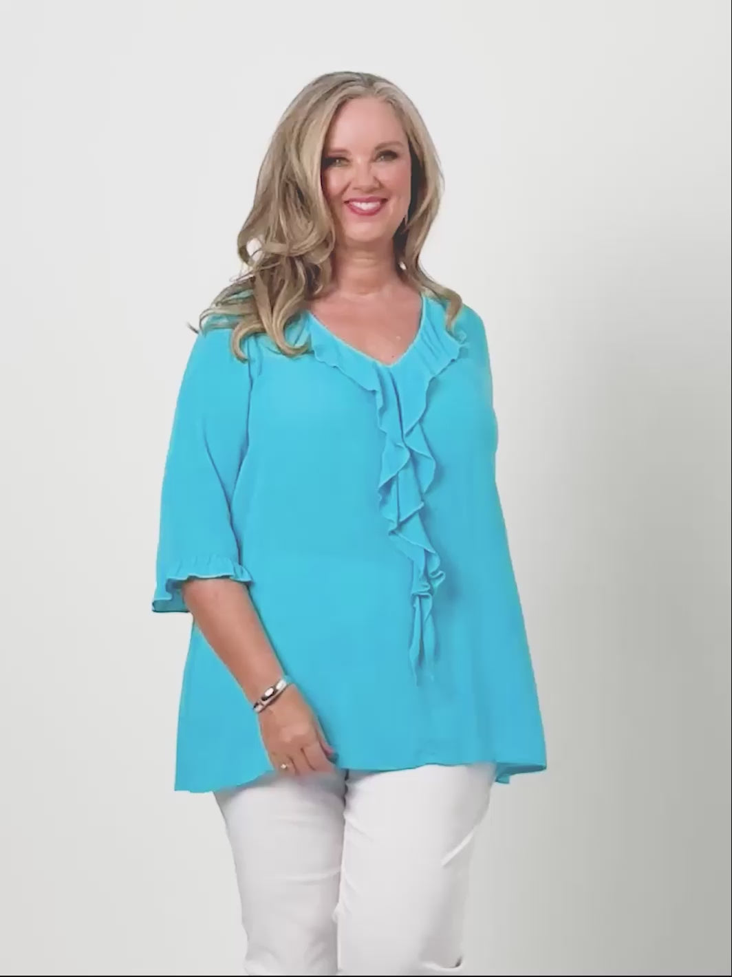 This vibrant turquoise plus size top is a breezy summer essential. Made from cool, lightweight rayon, it features a flattering V-neckline with soft cascading frills down the front. The sleeves sit below the elbow and are finished with a delicate frill detail for added charm. With a relaxed, easy-fitting silhouette, this top is perfect for keeping comfortable while looking effortlessly stylish. Pair with crisp white pants for a fresh and polished look.