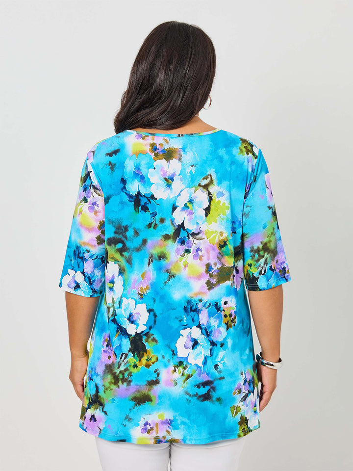 In a cool vision of coastal blue with a subtle floral design, this plus size stretch jersey top features a flattering V neck, an A line swing shape, and below the elbow length sleeves. Perfect for summer fun, it’s a great choice for weekends away or easy travel dressing.
