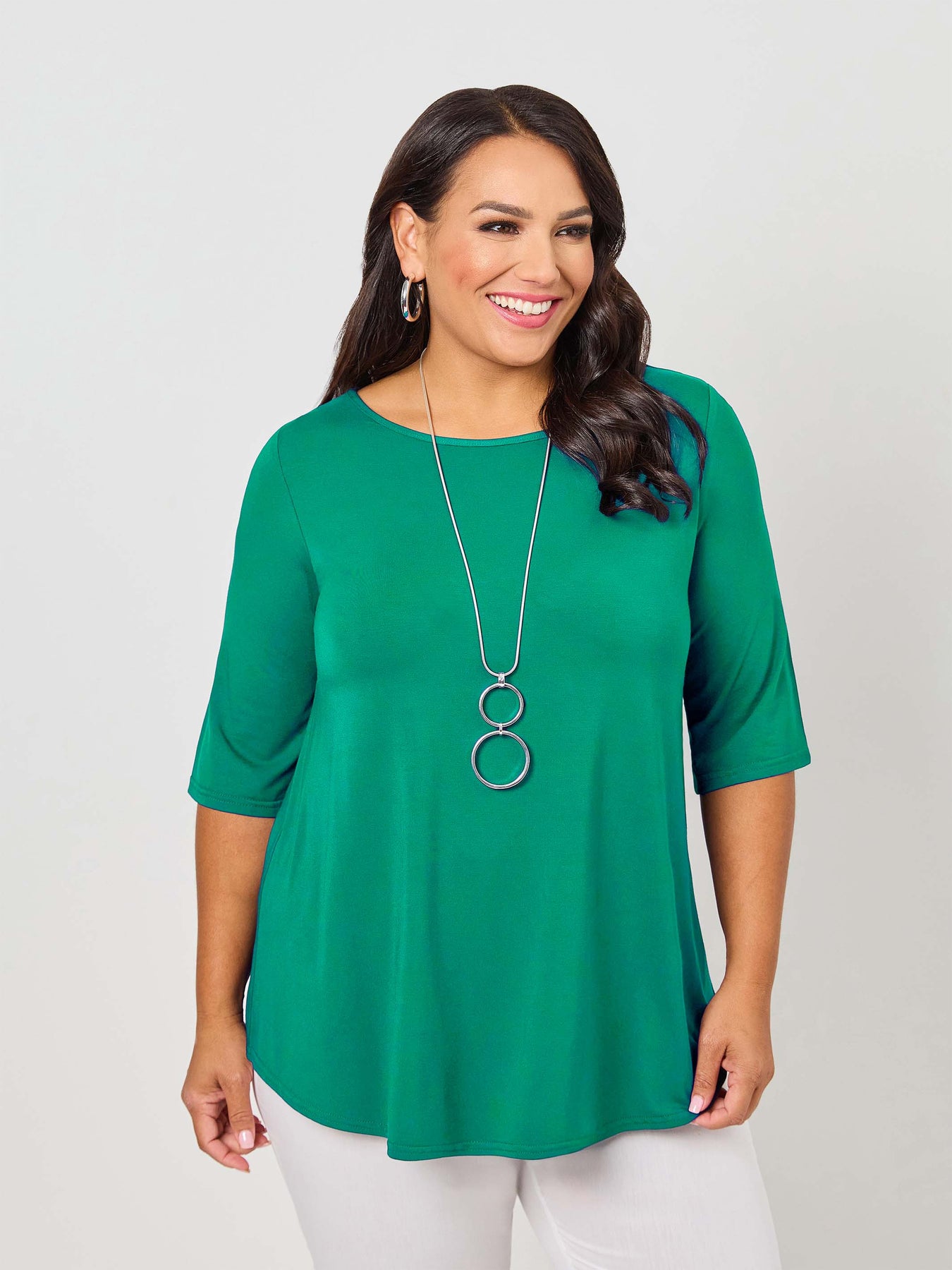 - Details: Below the elbow length sleeves, scooped neck and hemline, quality tee shirt style stretch fabric