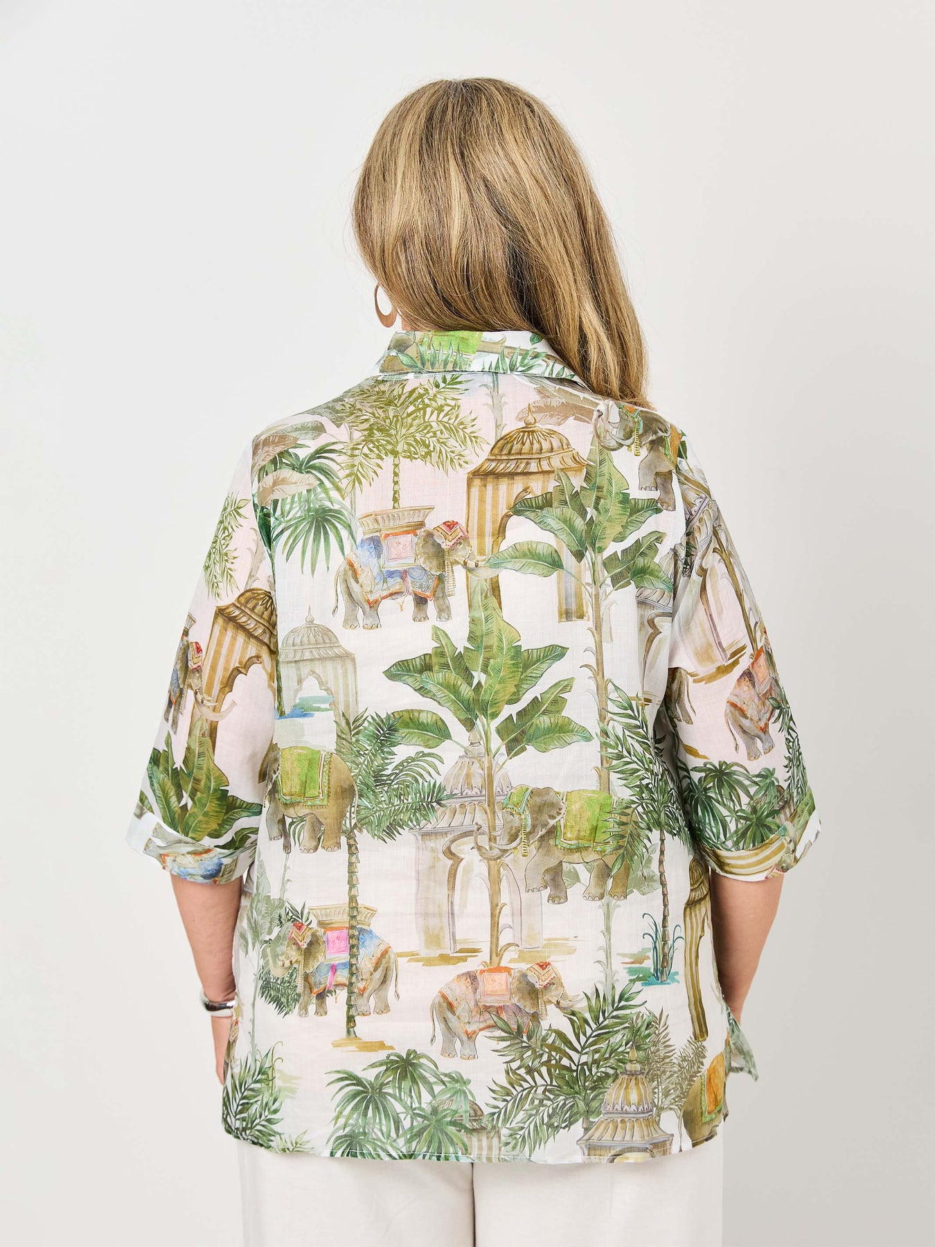 • Details: Buttons through, V-neckline with collar, Safari inspired print on an ivory base, ramie linen, straight hem, no pockets, upper forearm length sleeves, ample hip room