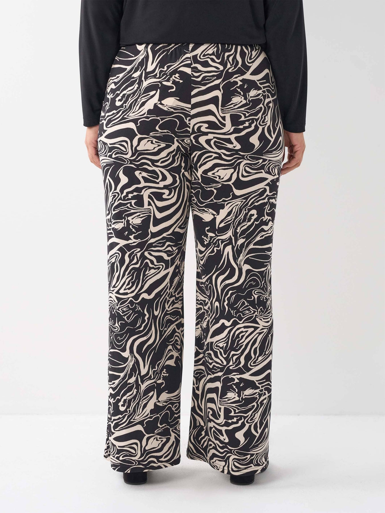 • Detail: Wider leg plus size pant, elastic waist band, the classic palazzo pant design, stretch jersey, an easy transition from day into night, abstract stone and black print