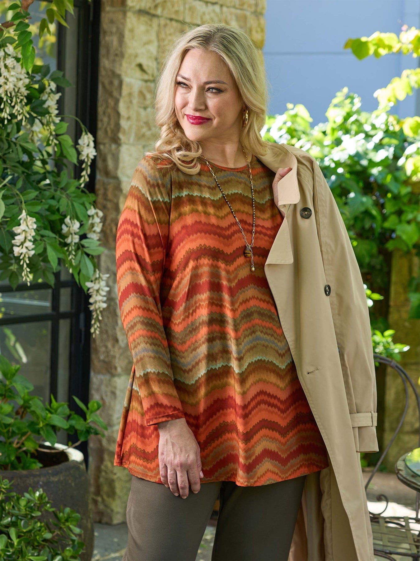 - Detail: Boat neckline, full length sleeves, A-line swing, straight hemline, ample hip room, zig zag wave design, stretch jersey