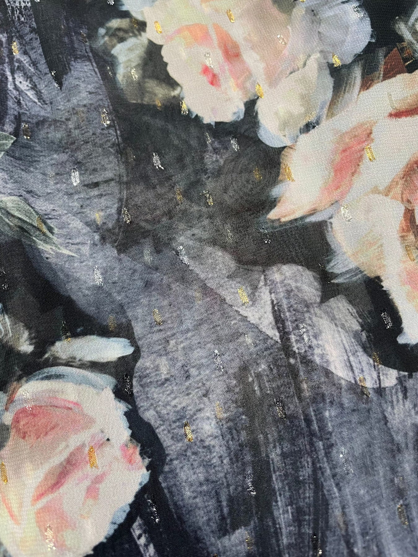 • Description: Waterfall front, edge to edge, flowing georgette, charcoal base with a rose print and delicate gold fleck highlights, romantic juliette 3/4 length sleeve,