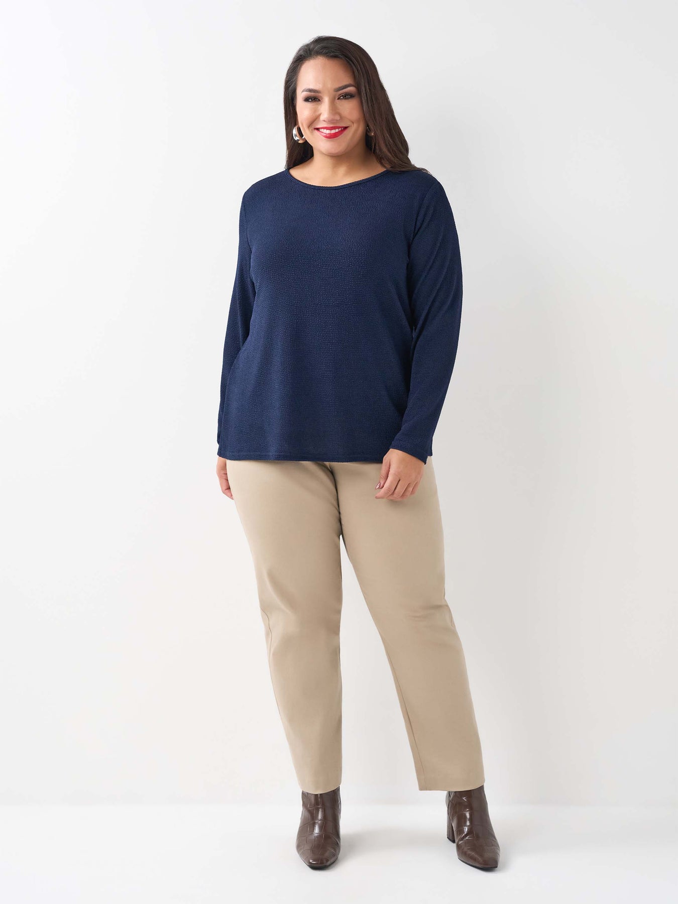 The ultimate easy to wear basic has returned. This shorter length, plus size top, in the fabulous textured “Popcorn” fabric features a scoop neck and long sleeves, making it perfect for layering or wearing solo for effortless style every day.