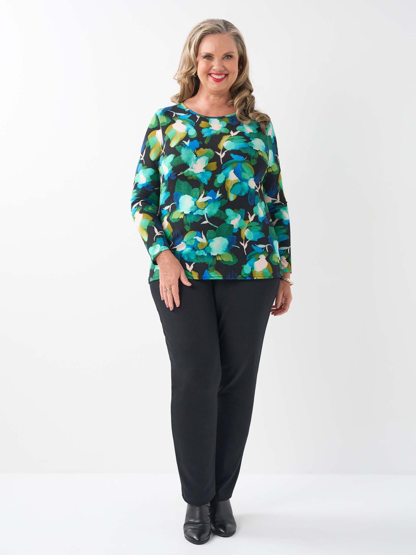 This classic shorter length plus size top is a winter must have. Made from warm stretch jersey, it has a flattering scoop neck and long sleeves with a black base brought to life by rich jewel tones that make it perfect for brightening up your seasonal wardrobe.