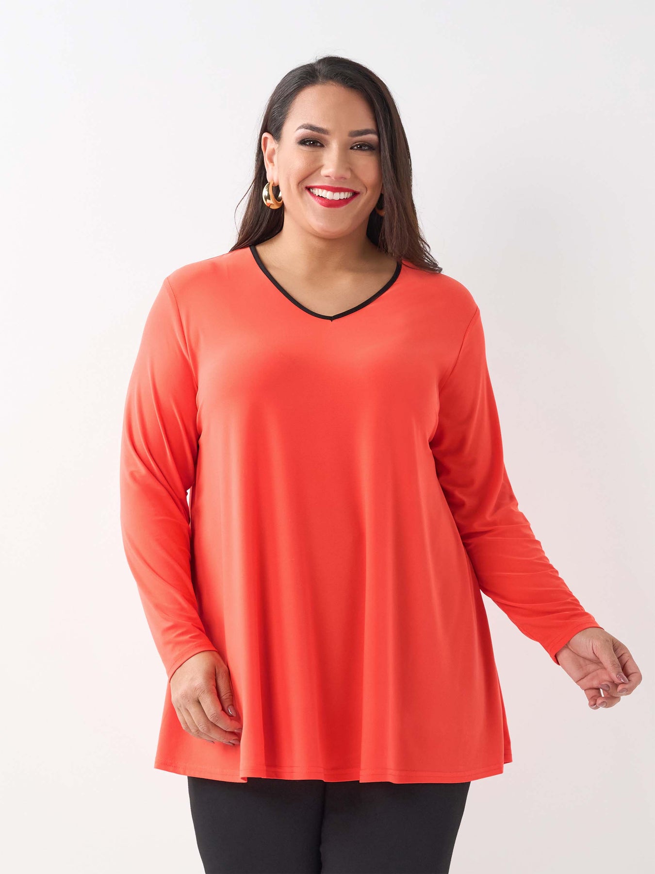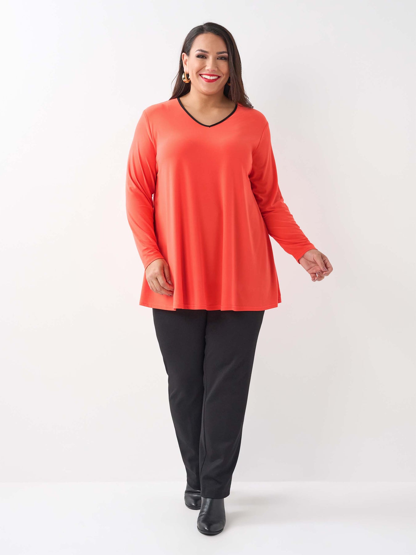Classic and stylish, this plus-size jersey swing top is a winter wardrobe essential and a great addition to brighten up any winter’s day. Its relaxed A-line fit makes it effortless to wear, while the V-neckline trimmed in black adds a chic contrast against the orange. Pair it with your favourite Swish pants for a flawless day-to-night look.