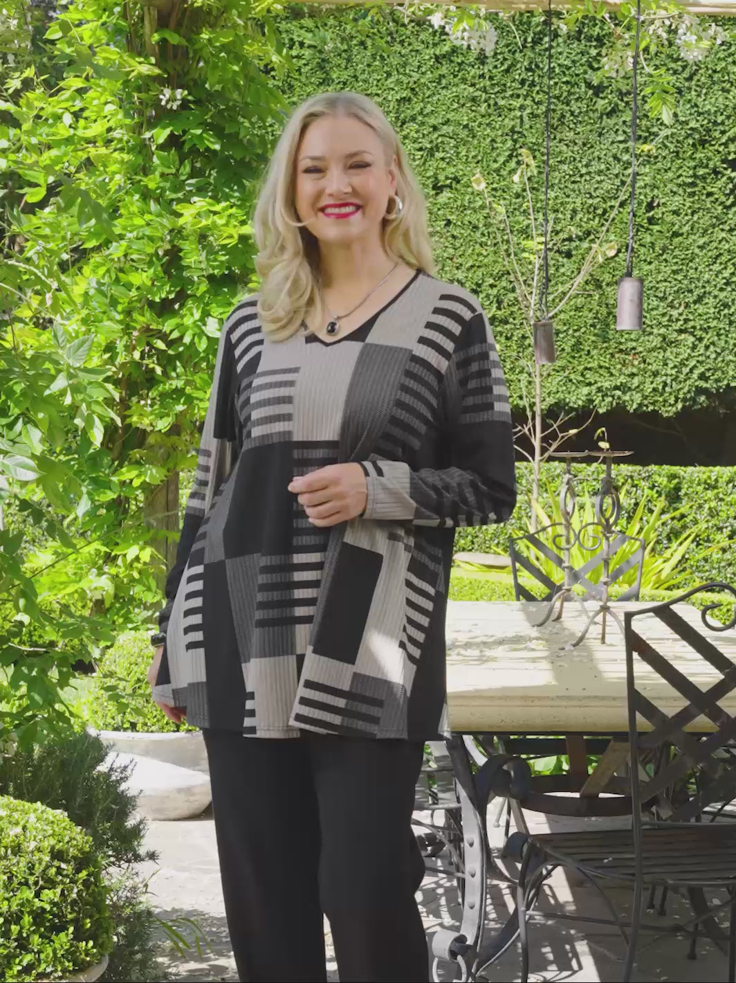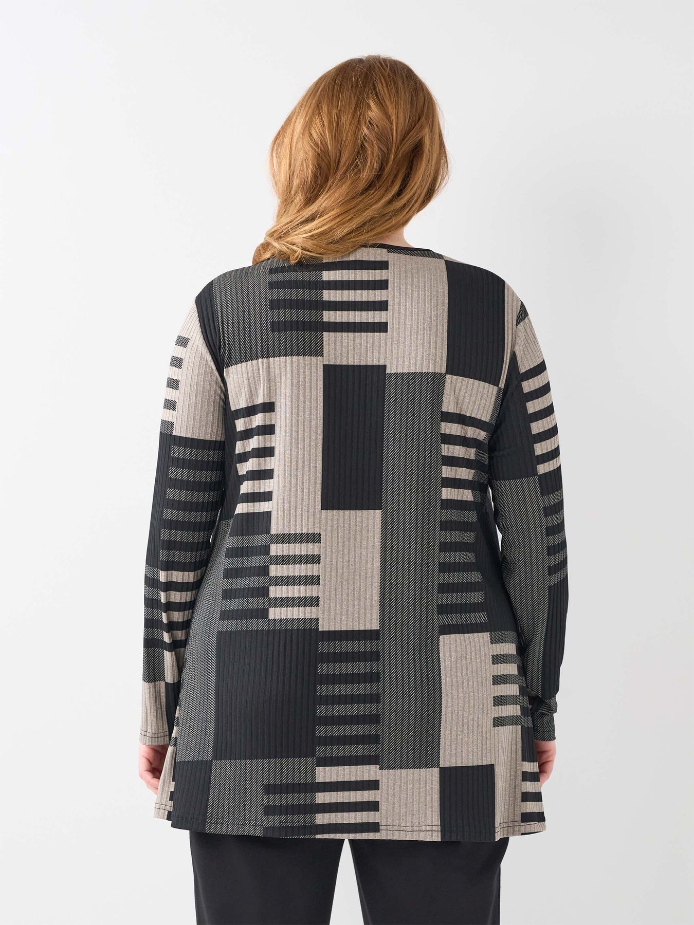 Step out in warmth and style with this plus size top. Its ribbed finish adds texture while the abstract design in a palette of greys, black and stone makes it perfect for everyday wear whilst the A-line swing adds that extra ease of wear.