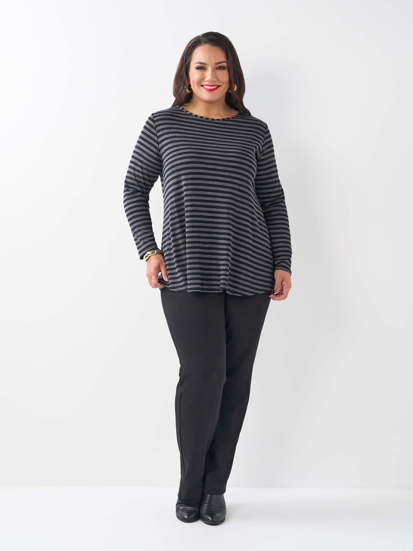 This plus size tee combines comfort and style effortlessly. It features full length sleeves, a flattering scooped neck, and a gently curved hemline for an easy, relaxed fit. The charcoal and black stripes add classic versatility, while the slightly A line shape provides a graceful silhouette. Made from a cosy wool and acrylic blend, it is warm and soft to wear, perfect for layering or on its own for everyday elegance.