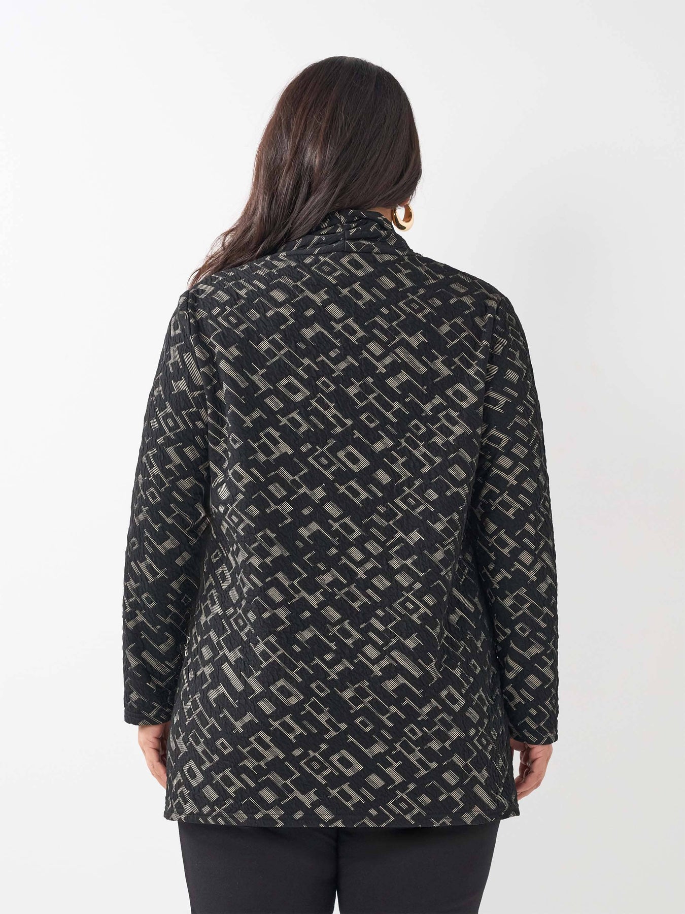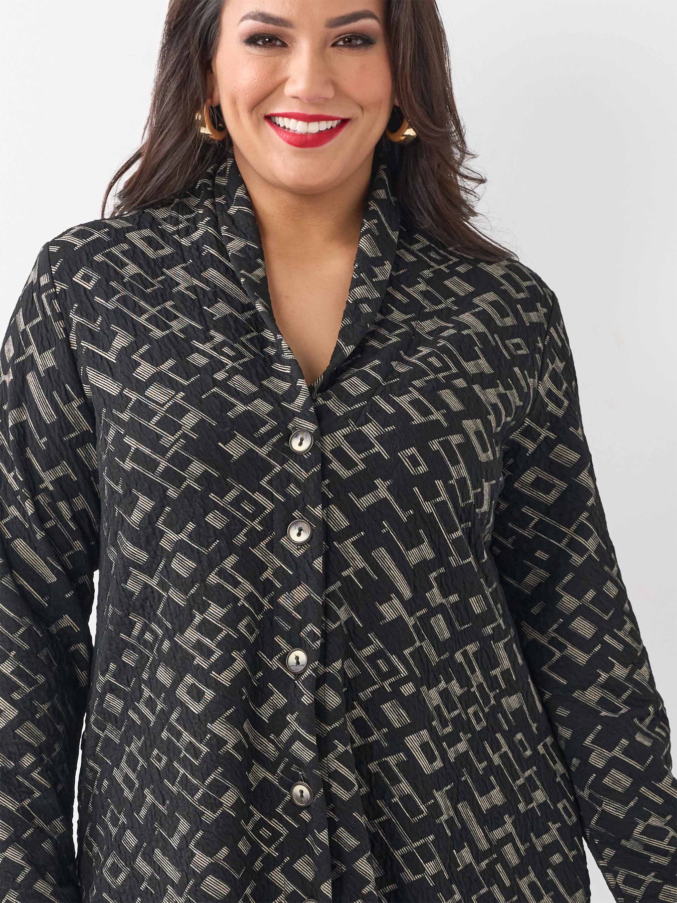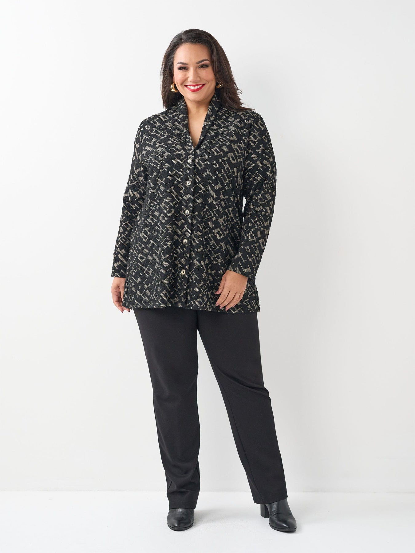 This versatile plus size cardigan combines elegance with effortless style. Featuring a bold geometric pattern flattering V-neckline and a five button close, it’s ideal for transitioning from casual daywear to polished evening looks. Pair with Ponti pants, denim, or jersey for endless styling options.