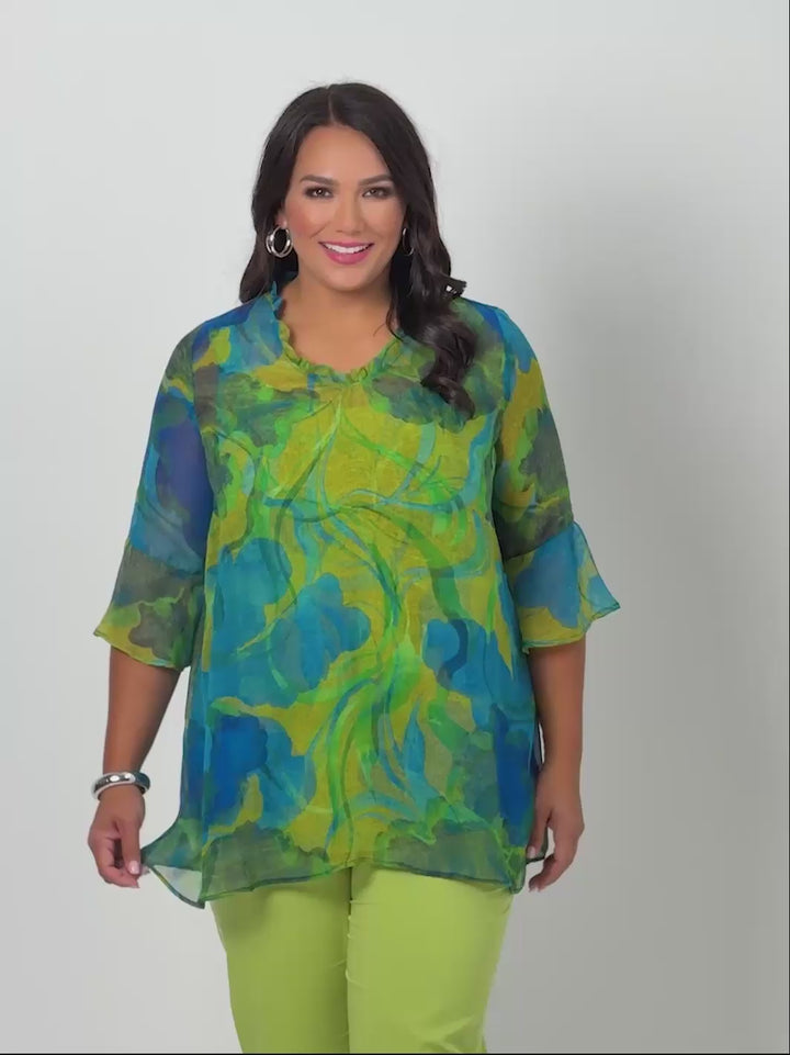 Two gorgeous pieces for the price of one. This stunning plus size top comes complete with a matching jersey cami, offering effortless style and great value. In opulent shades of chartreuse and aqua blue, the soft chiffon overlay is brought to life with feminine frills and vibrant summer colour. A truly beautiful duo that captures the essence of the season.