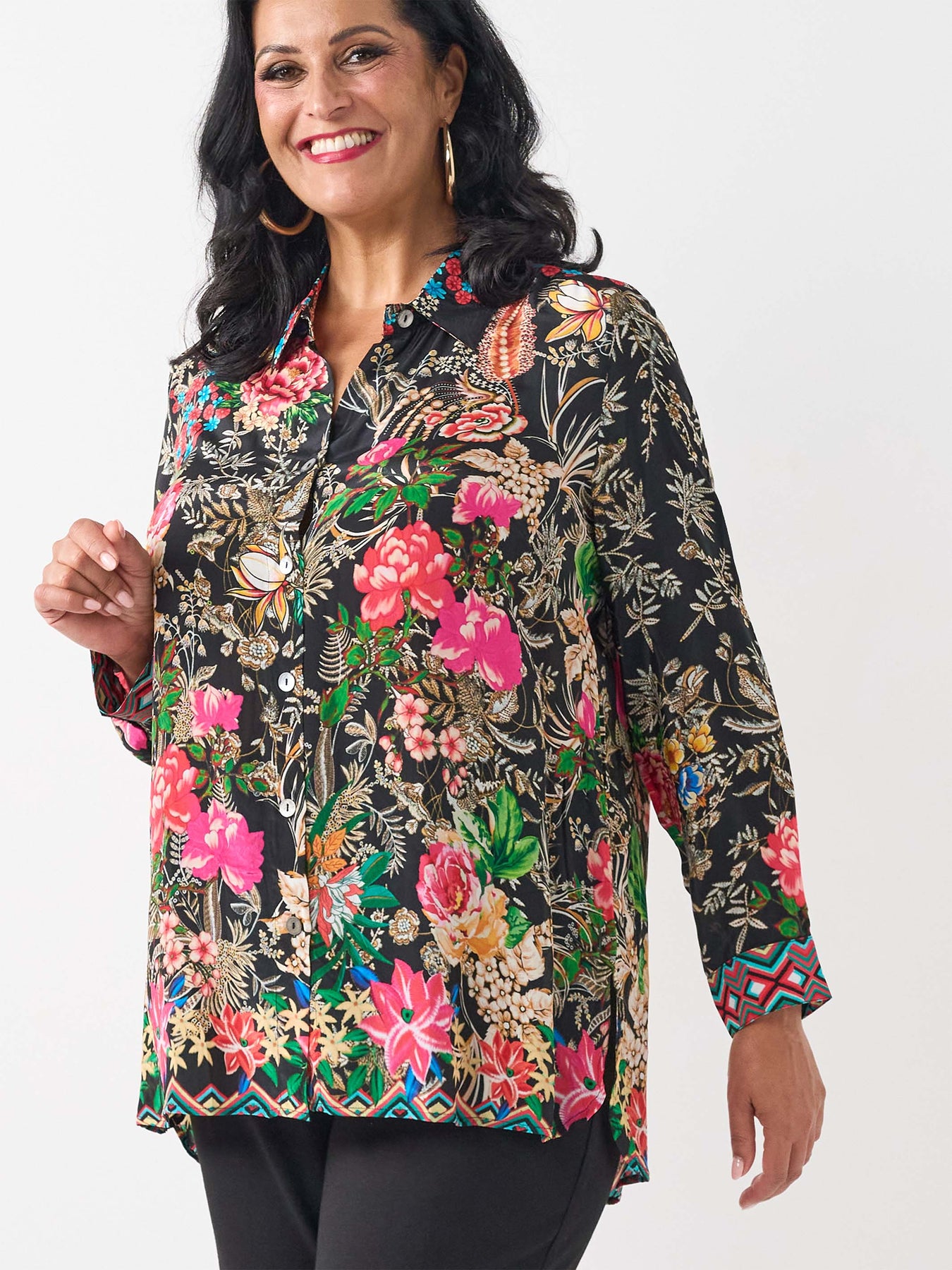 - Details: Collar, button through, straight hem, full length sleeves with button, non stretch, striking floral design on a black base, cool to wear viscose, ample hip room