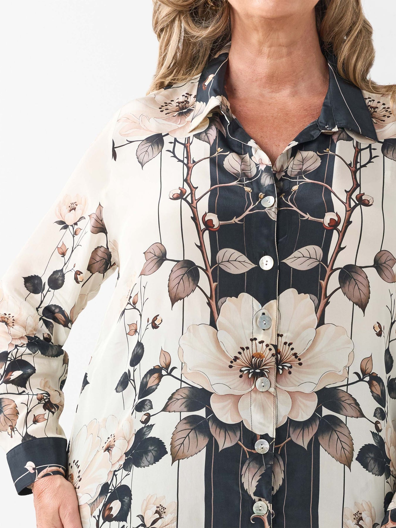 - Details: Collar, buttons through, straight hem, slightly curved with gentle side splits for ample hip room, full length sleeves with cuffs and single button close, silky feel printed viscose, yoke for comfortable fit, action back inset pleat for easy movement