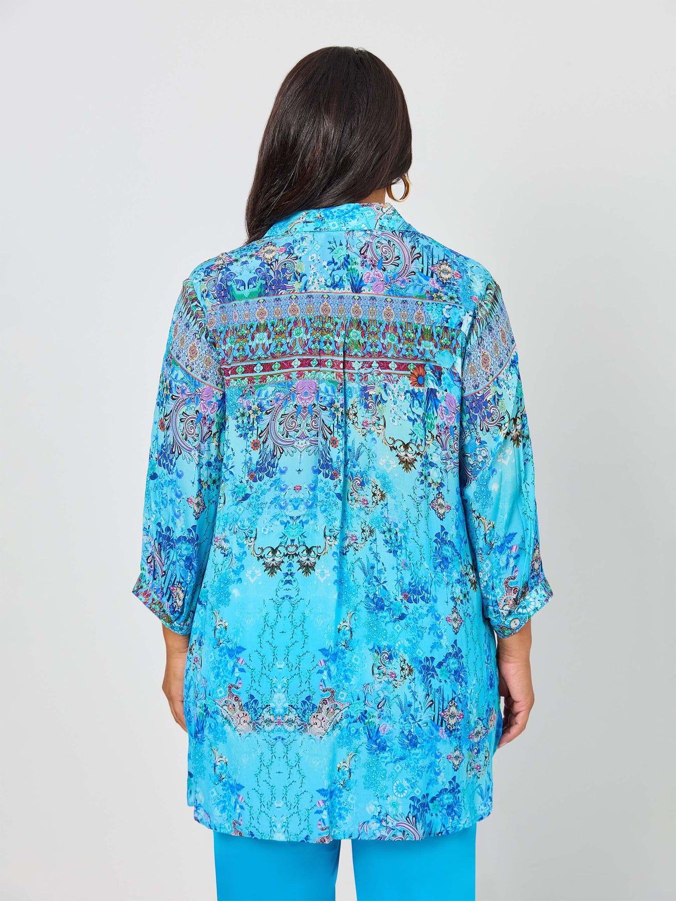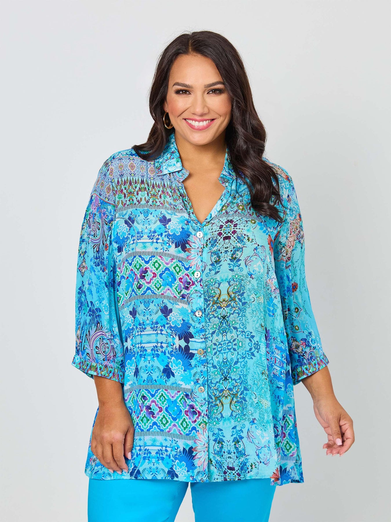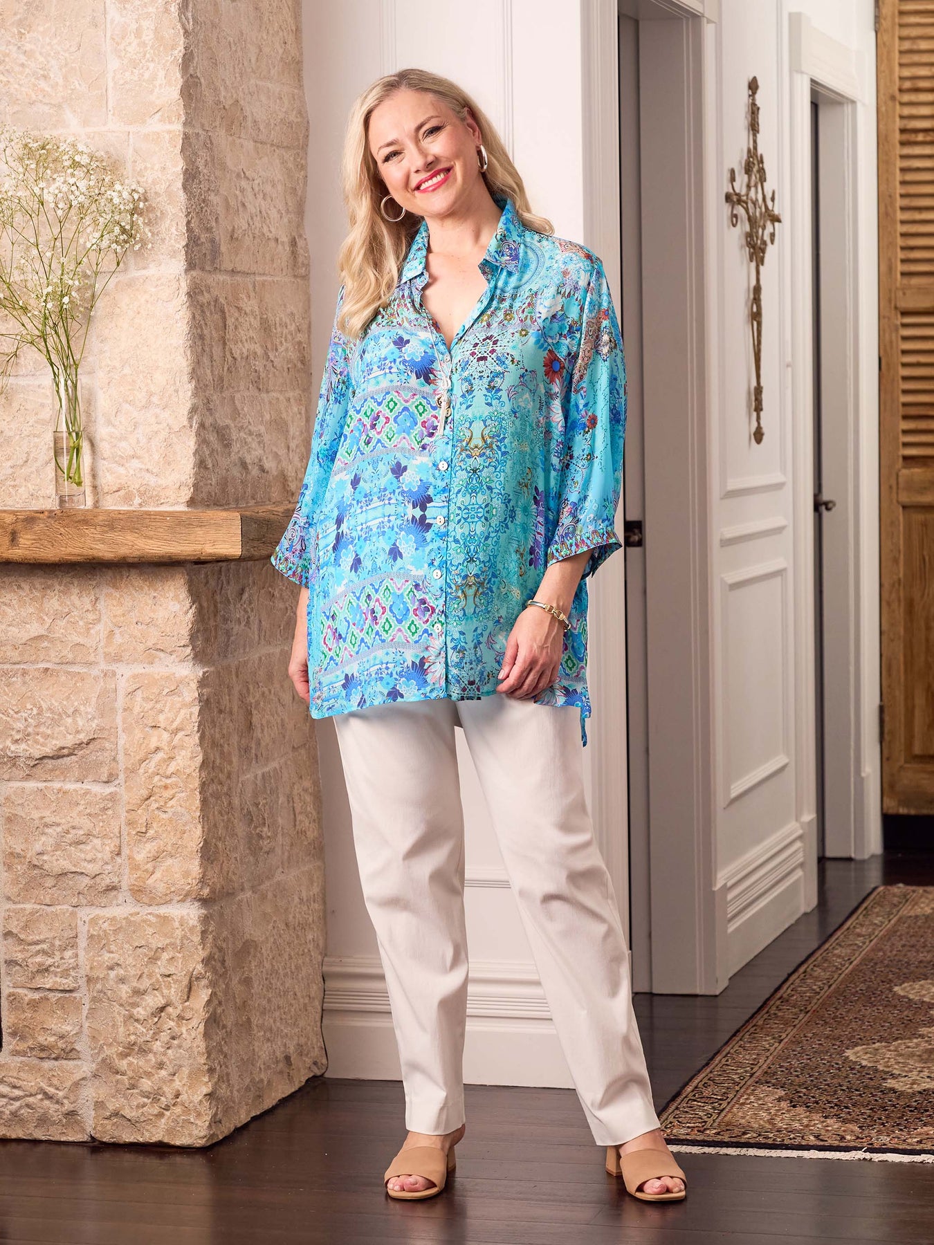 Summer never looked and felt so good! This gorgeous print shirt is the perfect staple piece for the upcoming warmer months. With its chic button-through collar design and eye-catching print, this deliciously silken touch shirt will be your favourite go to for the season. Pair back with crisp white or for that touch of summer freshness, take a look at the turquoise cotton stretch pants (style 642009).