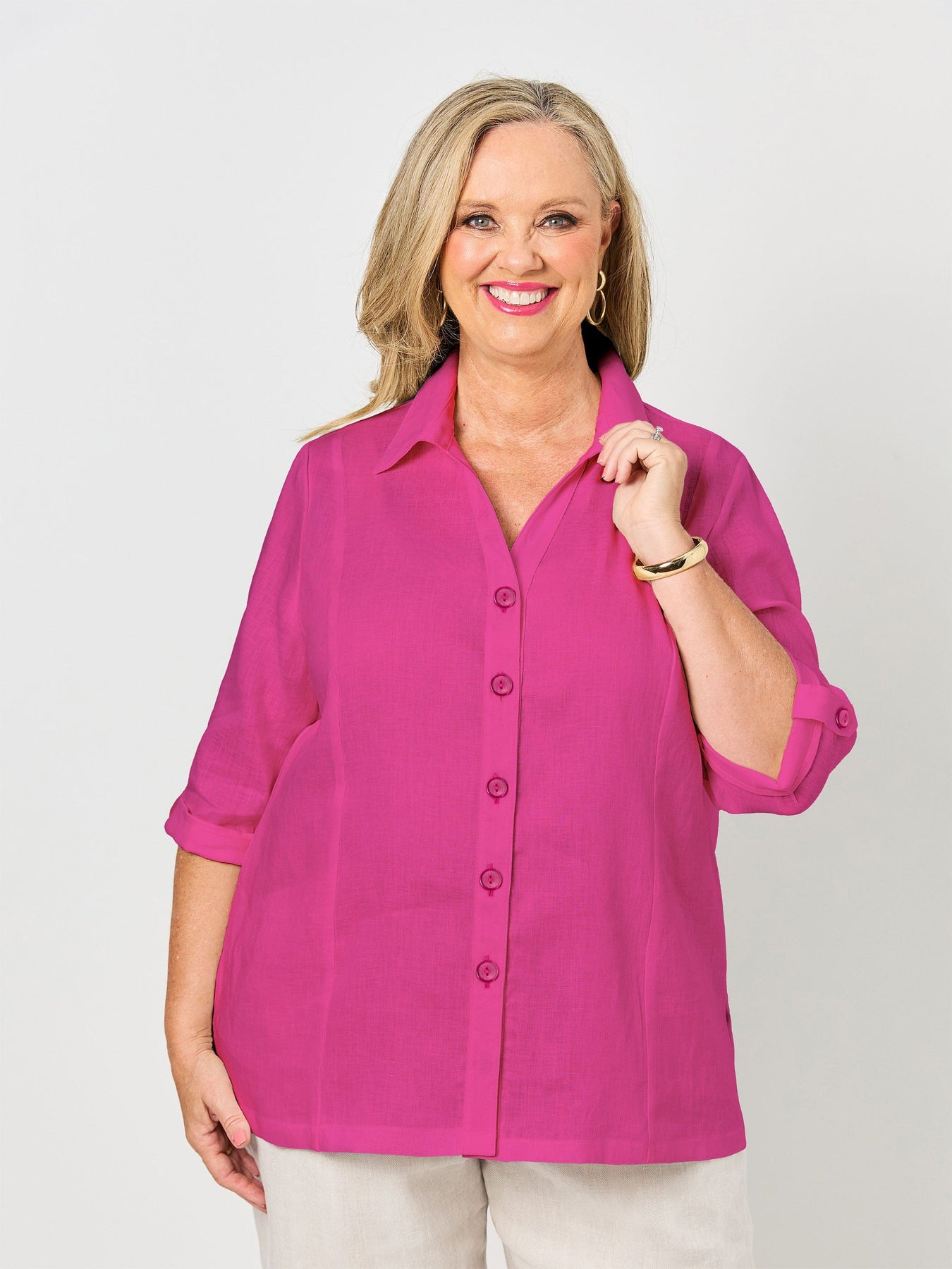 Linen is a summer essential, and this tailored tab-sleeve linen shirt ticks every box. Available in captivating cerise, timeless black or fresh white, this classic plus size style blends the natural coolness of linen with the effortless sophistication you know and love from Swish. A true wardrobe staple you'll reach for all summer long.
