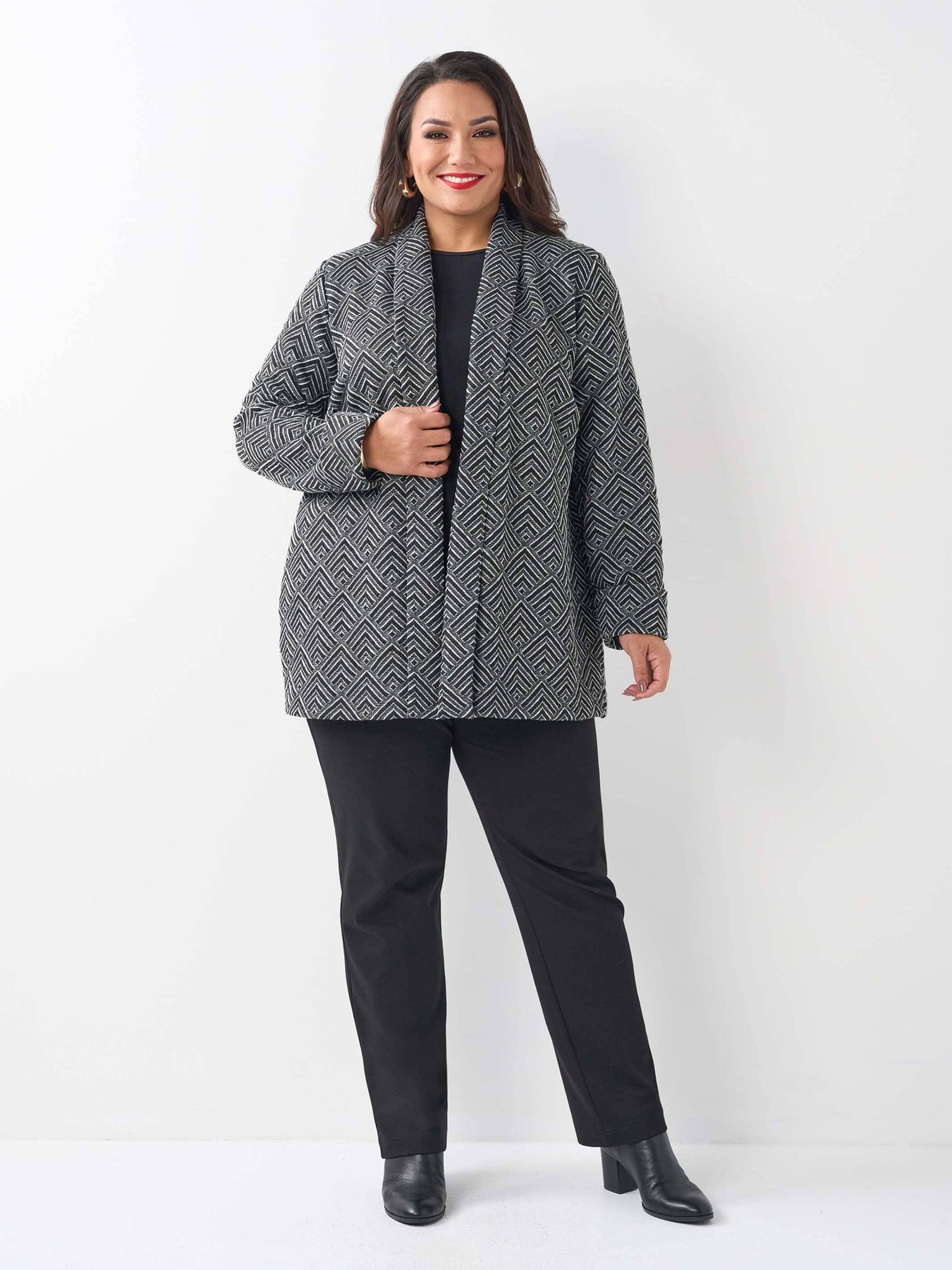 - Details: Black and white Chevron design, relaxed flattering silhouette, winter weight fabric for warmth and structure, unlined, long sleeves with wide band cuff, open front design, functional side pockets hip length, stretch, easy to layer over knits and tops