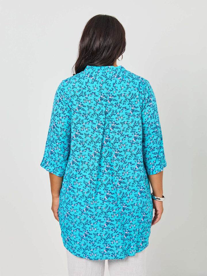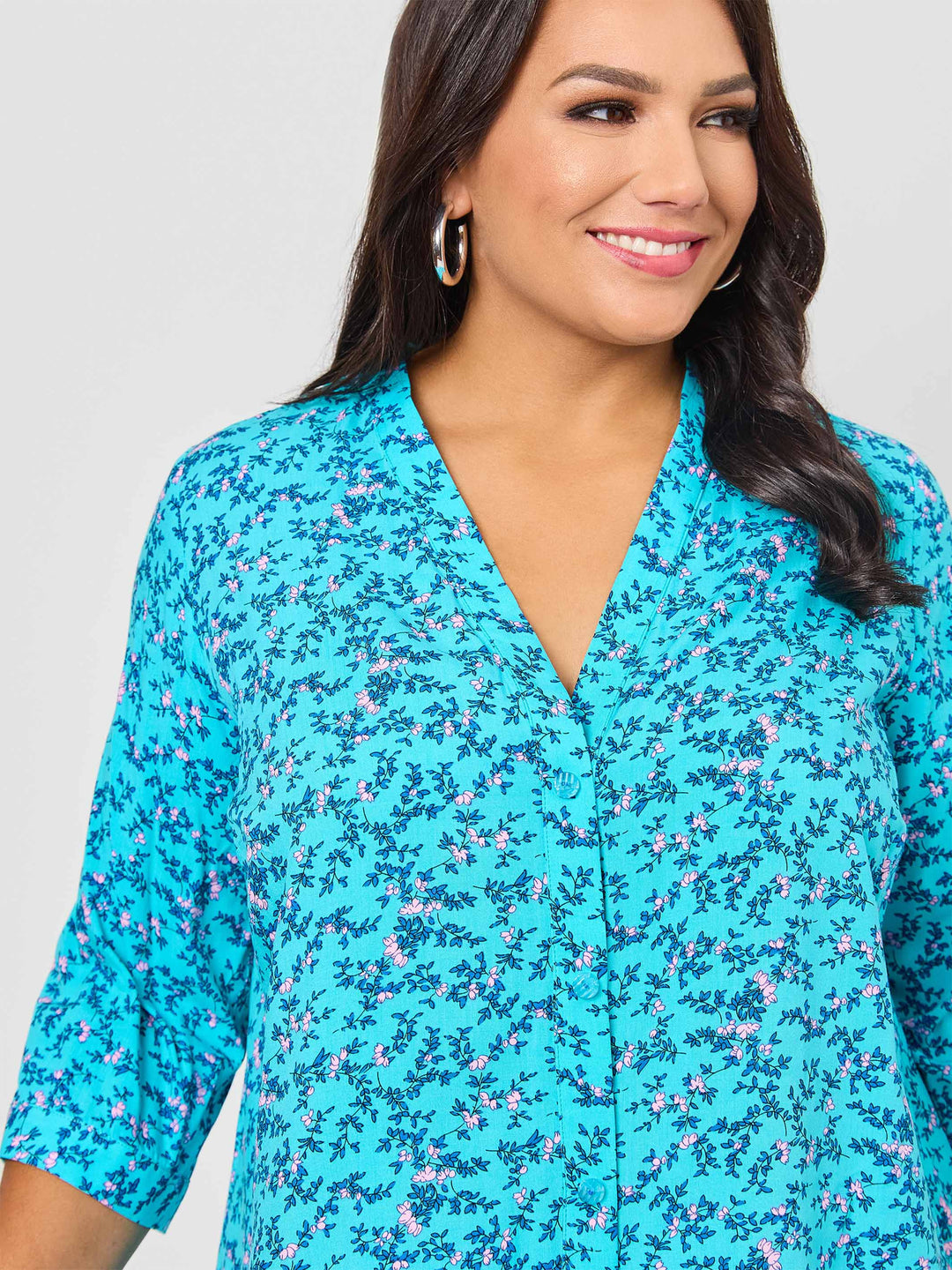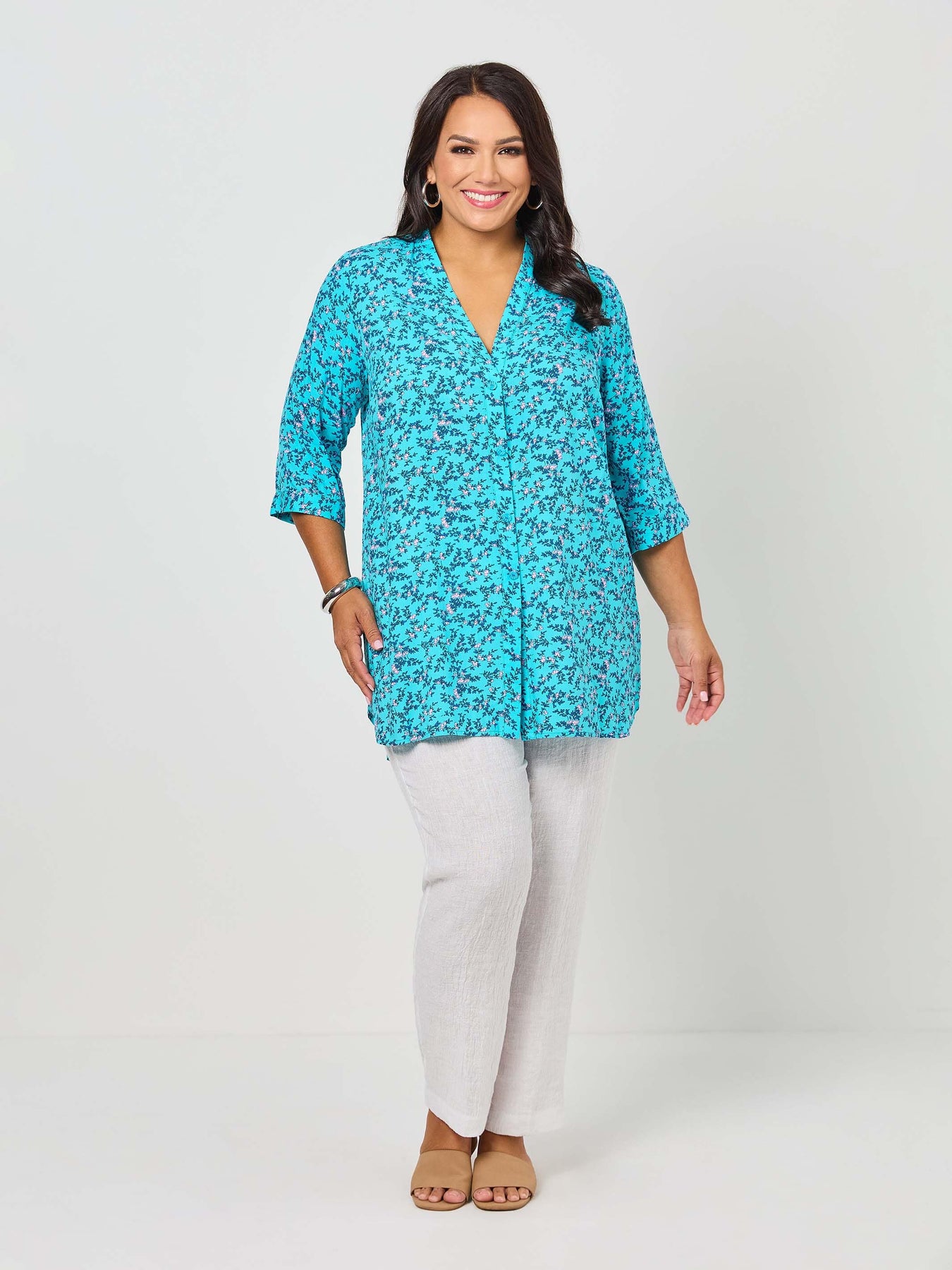 Fresh summer colour blooms in this charming blue daisy print, crafted in cool, lightweight rayon. This button through plus size shirt features a flattering V neckline and easy, relaxed styling. Whether you're heading to a BBQ or meeting friends for lunch, it's the perfect cool and comfortable choice for warm summer days.