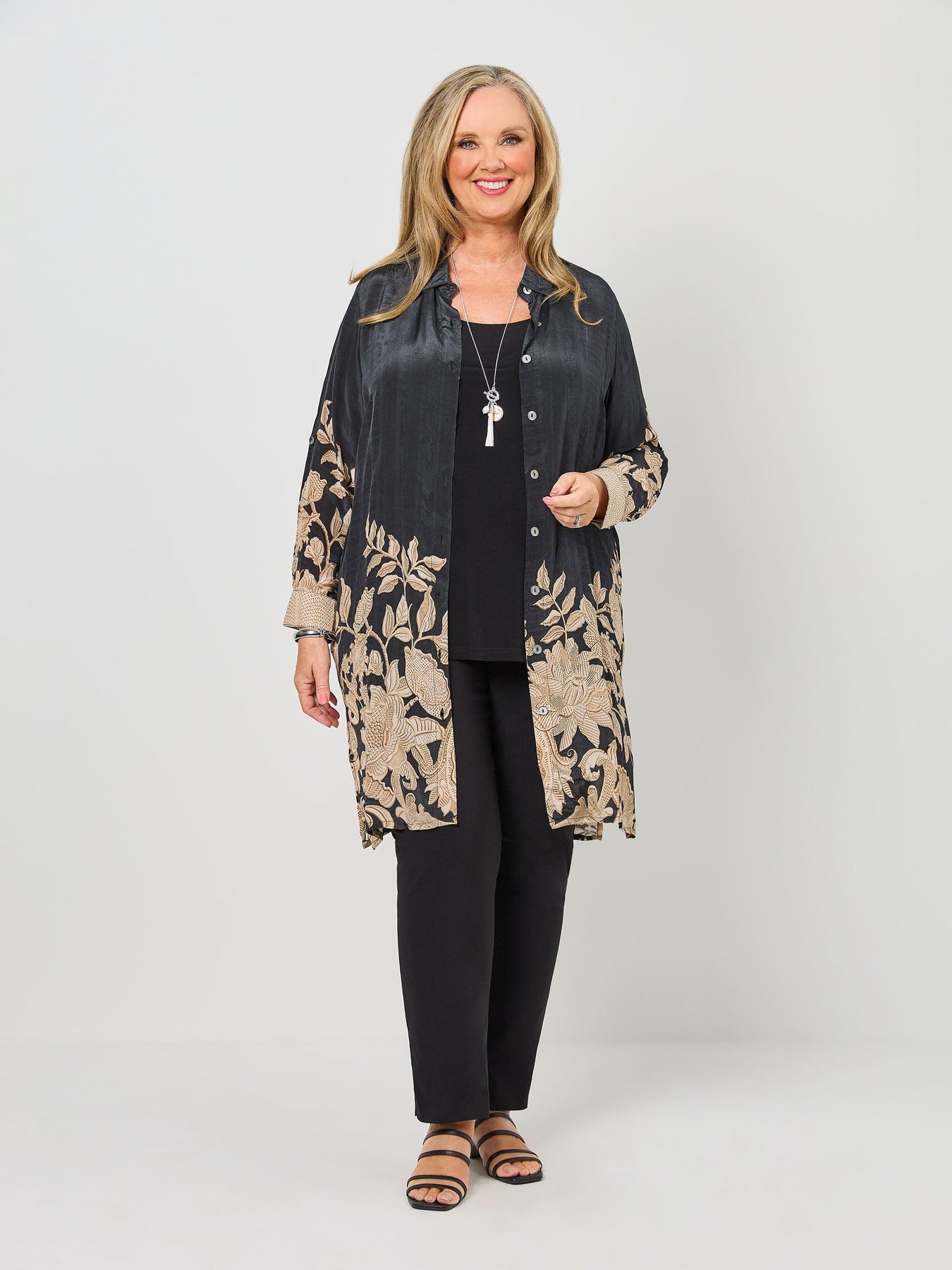 Chic design meets soft, silky viscose in this elegant long line evening shirt. Crafted for both comfort and sophistication, this plus size piece offers effortless style and excellence in occasion dressing. Wear it open or buttoned up, the classic muted black base with its subtle champagne flora design creates a truly beautiful and refined look for any special evening.