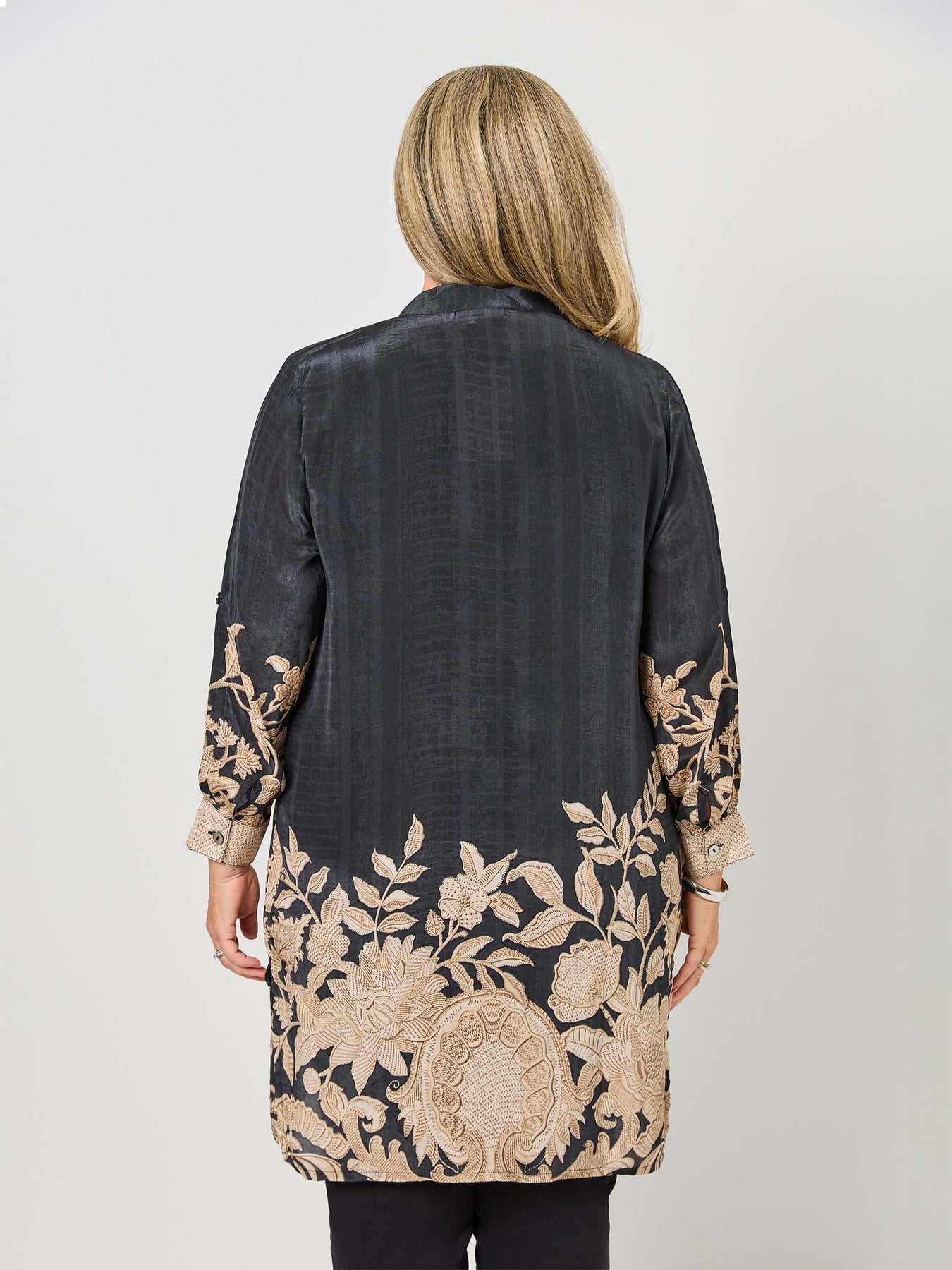 - Details: Collar, button through, long line, straight hem with champagne floral contrast print border, full length sleeves with champagne contrast cuffs, side splits, printed viscose on a muted black background with stunning floral print
