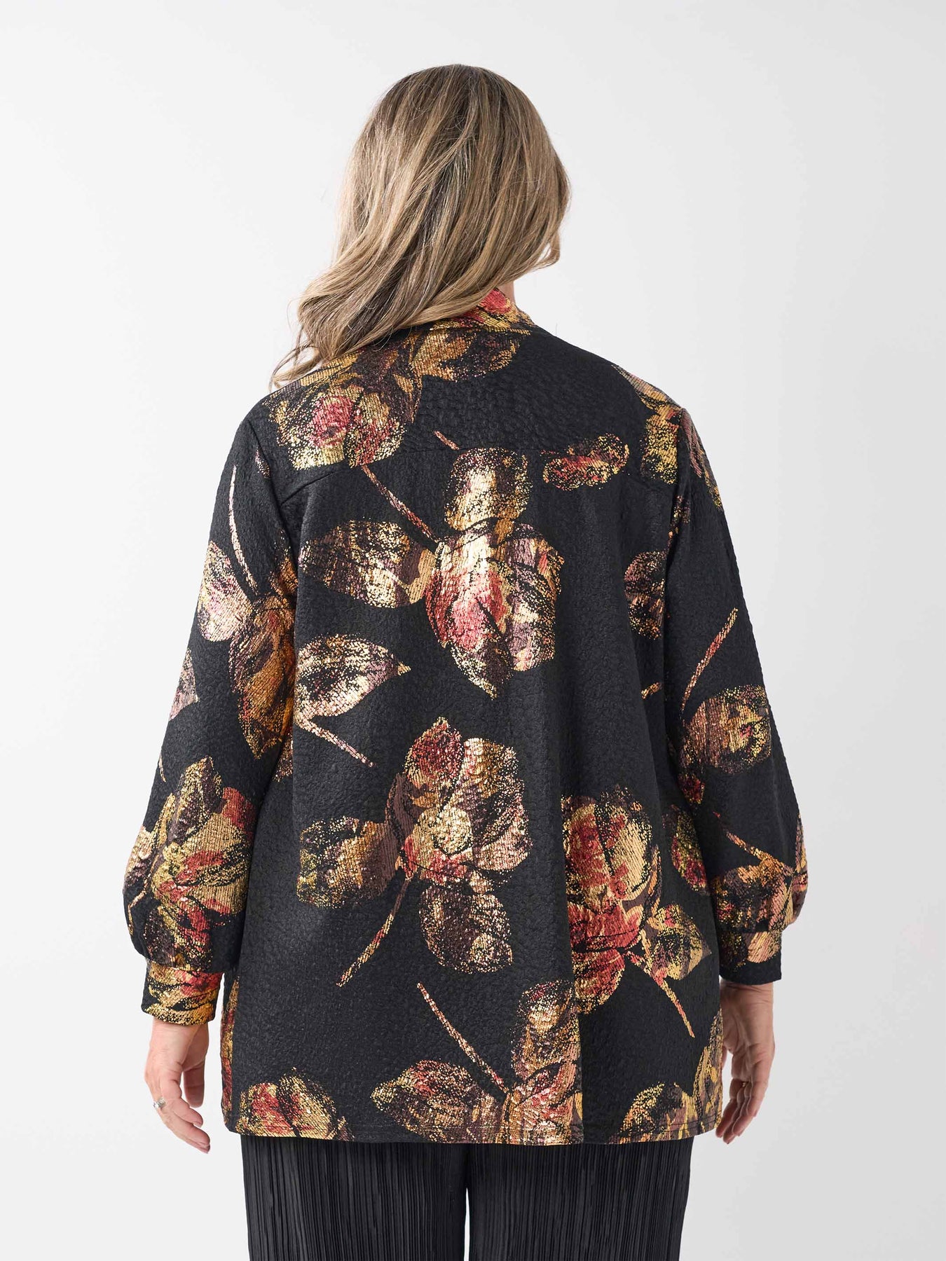 - Detail: Stylish edge-to-edge plus size jacket, elegant but relaxed styling, full length sleeves with cuff band, luxurious gold Metallica stretch fabric, black base