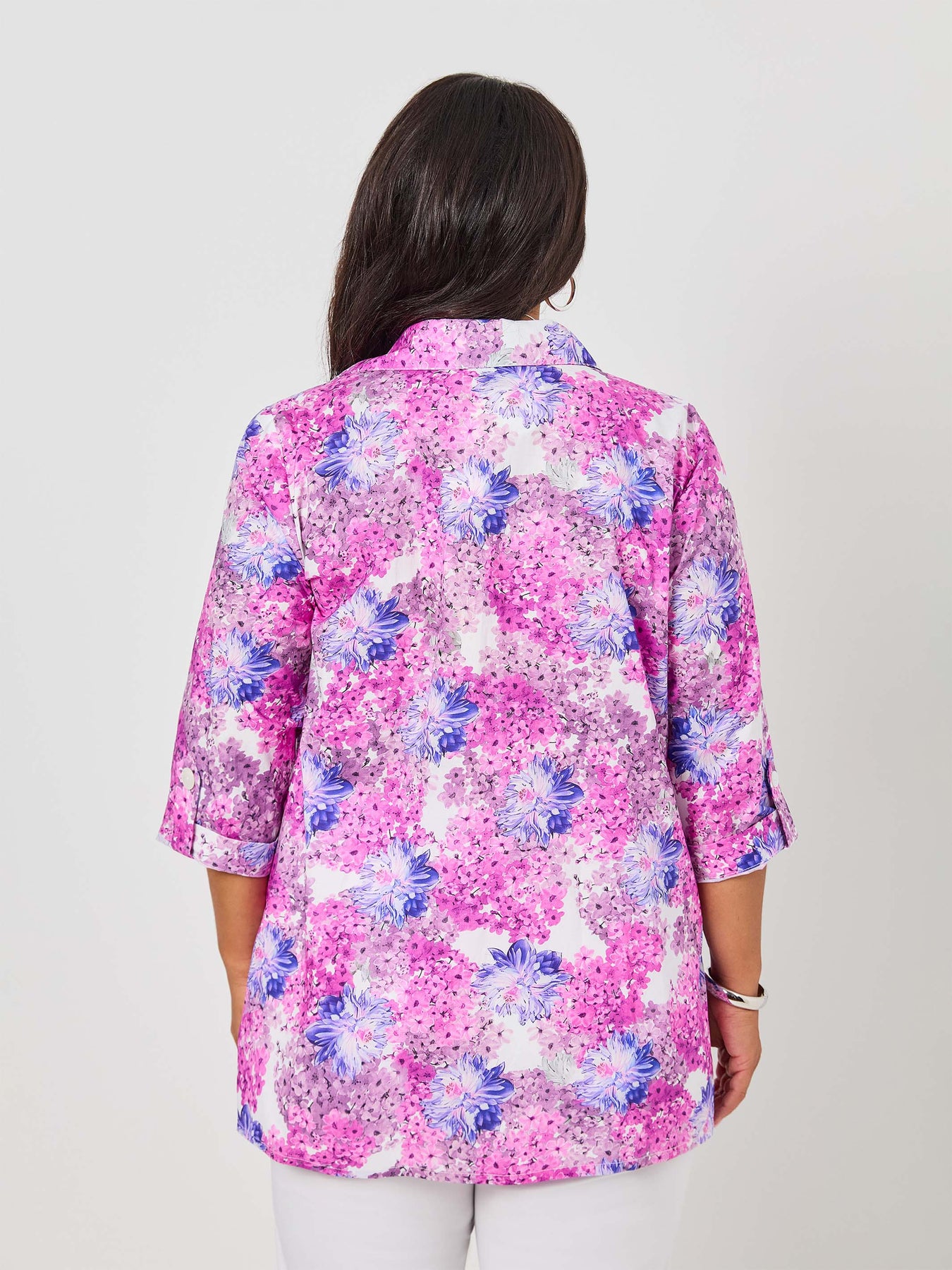 Reflecting a cool and effortless style in cotton, this plus size shirt is both pretty and practical. Perfect for popping on and heading out, whether it’s lunch with friends or a casual stroll, you’re sure to stay cool and comfortable. Soft lilac wisteria tones pair beautifully with crisp white for a fresh summer look.