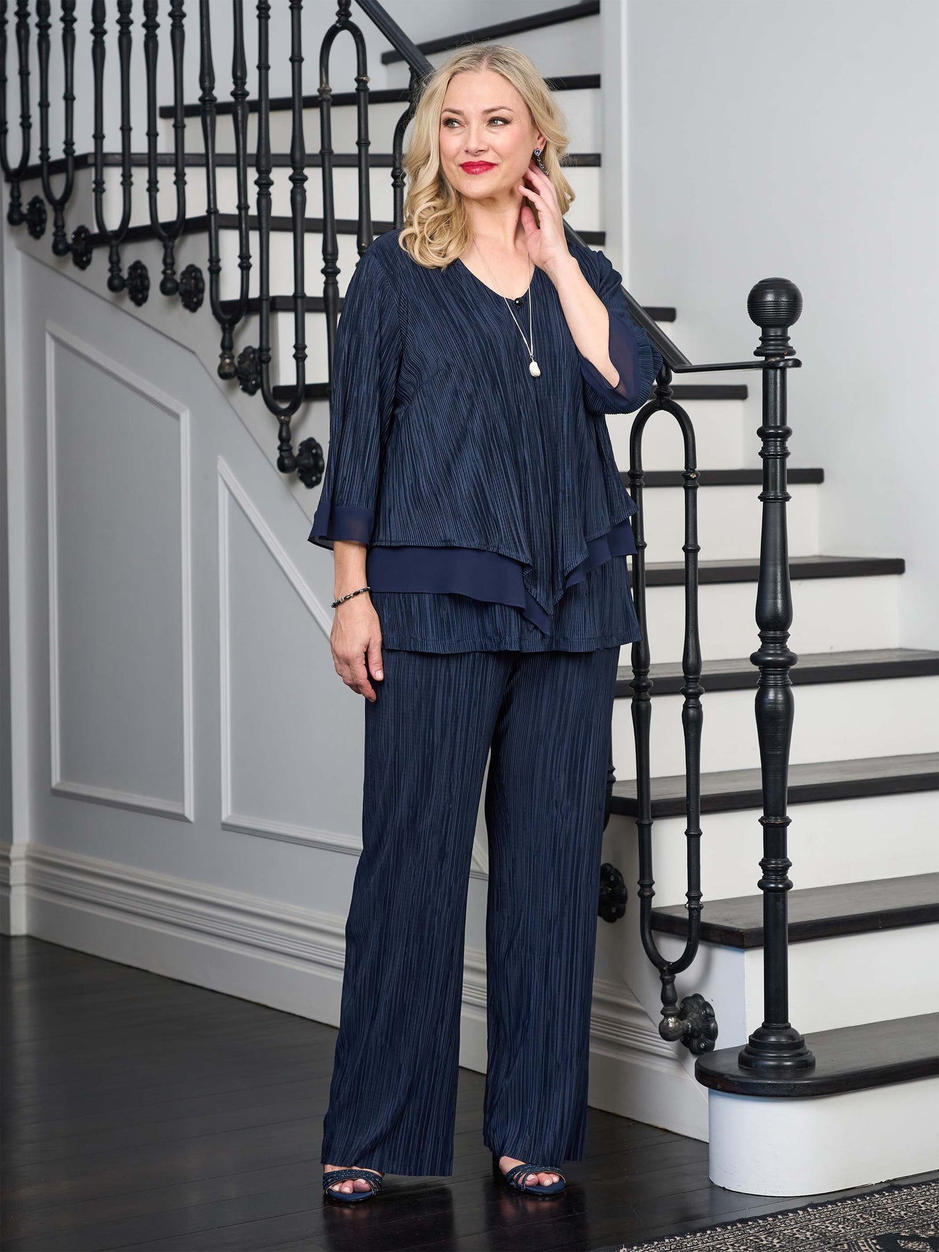 Graceful and stylish, this plus size pleated pant brings a touch of elegance to your eveningwear. The soft pleats offer movement and a flattering fit, making it both comfortable and chic.