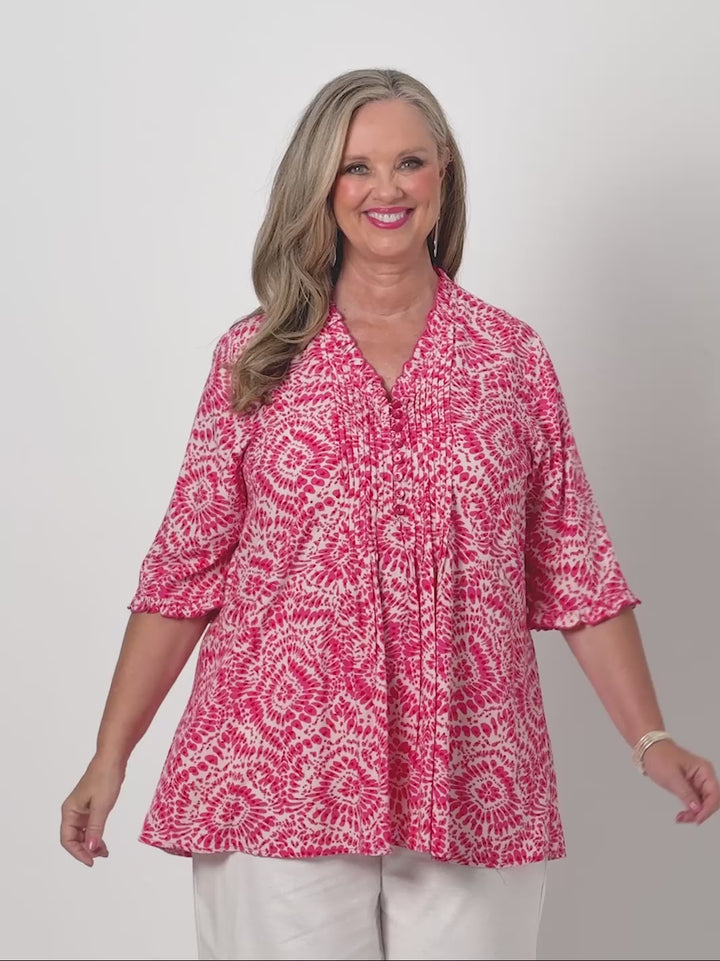 - Detail: Cool to wear rayon, sweet floral print, pink base, upper forearm length sleeves with petite frill detail, V-neckline with delicate frill detail, pintucking to front of top, ample hip room, buttons through to midway, unlined, straight hem