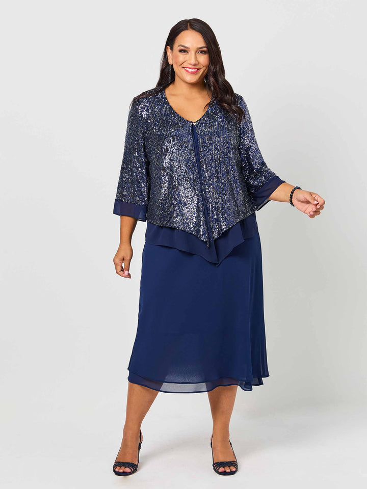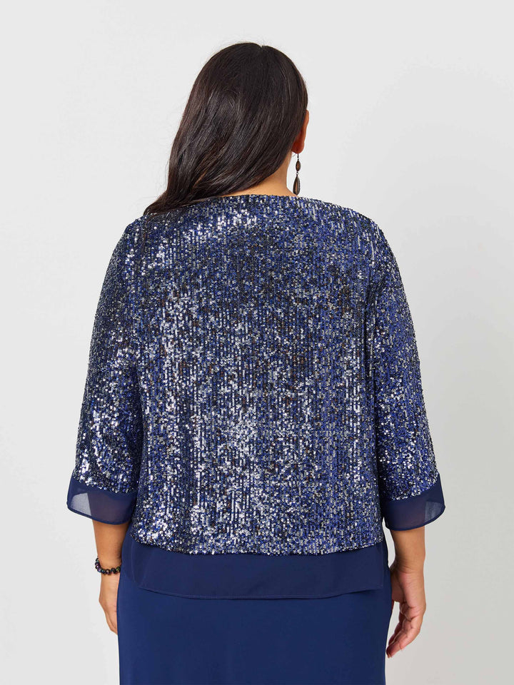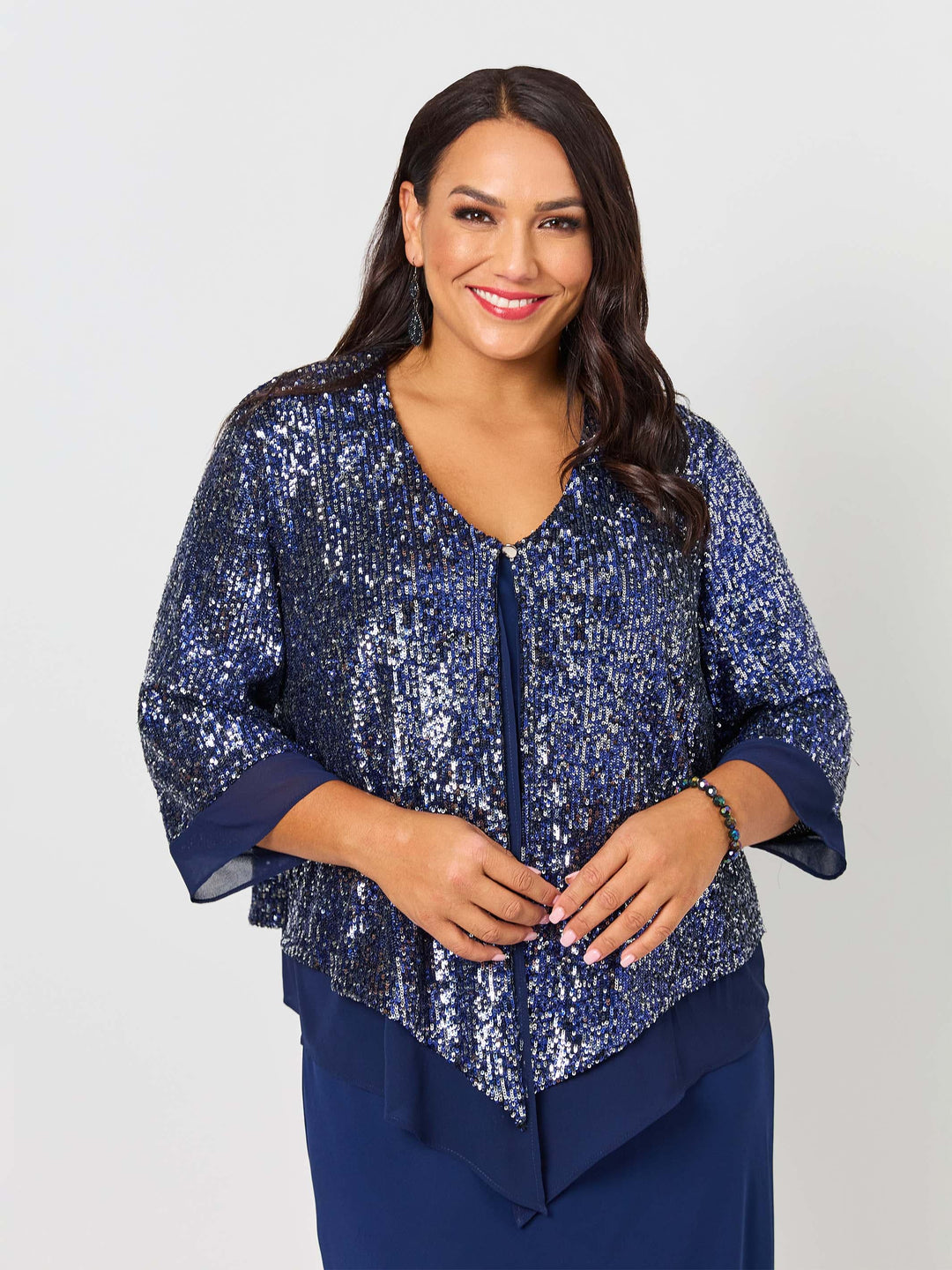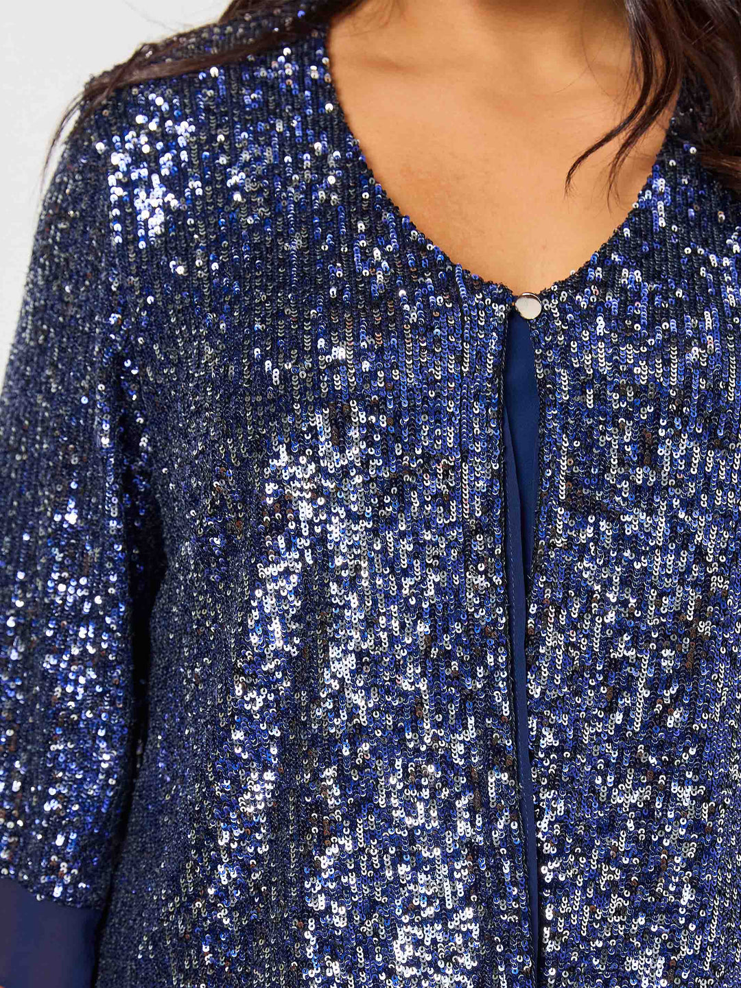 Sequin Sparkle Double Layer Plus Size Evening Jacket - Navy
