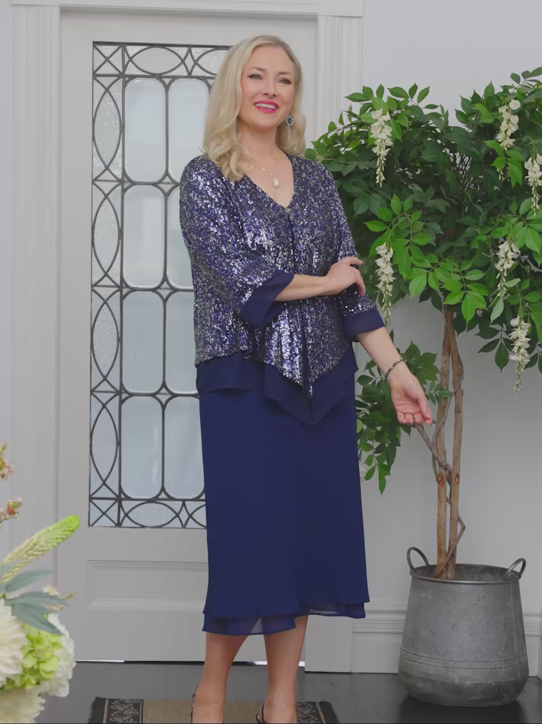 - Details: Double layered, sequins over plain navy georgette, peak front, single button close, sequin 3/4 length sleeves with plain contrast georgette cuffs, suitable wedding attire