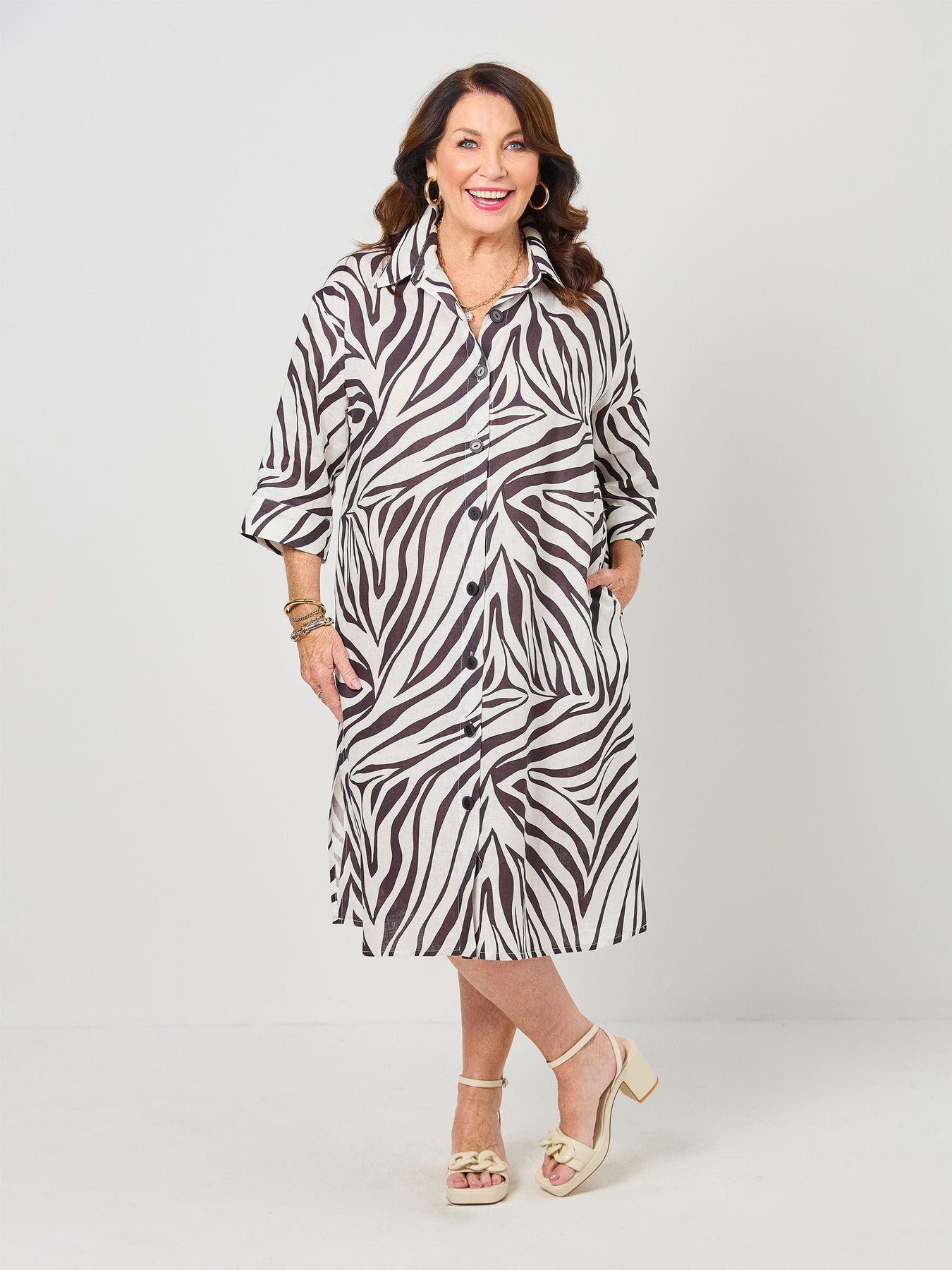 - Details: Button through, smoky black and white Zebra inspired print, collar, mid forearm length sleeves turn back cuff, straight hem with side splits, ample hip room, 2 pockets