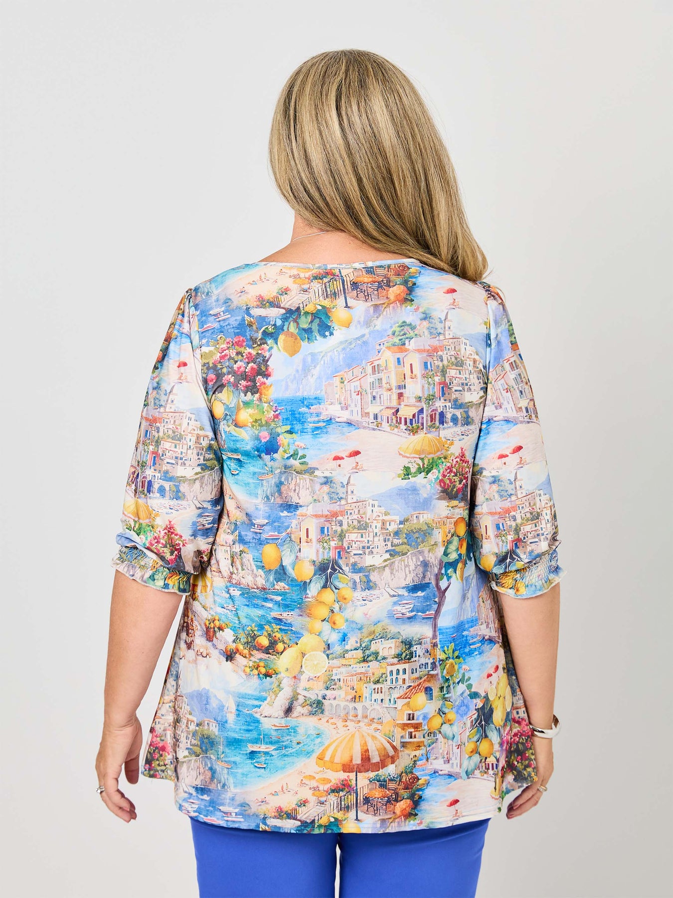 • Detail: Round neckline, mid forearm length sleeves with elastic shirring and small dainty frill, straight hem,  Mediterranean inspired print, stretch jersey, flattering A-line swing with flattering shaping through the bust, ample hip room