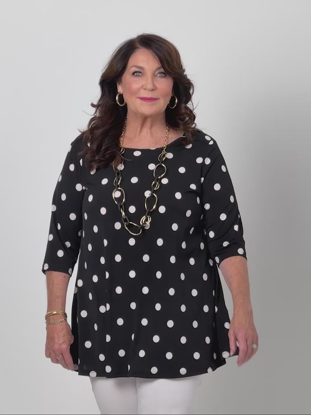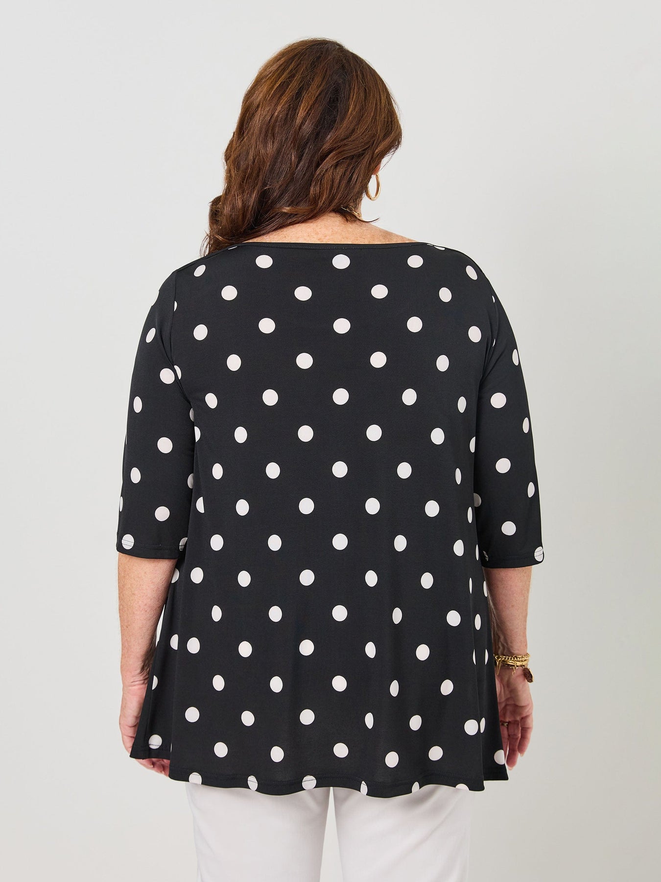- Detail: Straight hem, boat-neck with stitched shoulder detail , black and white spot jersey, mid forearm length sleeves, A-line swing, ample hip room