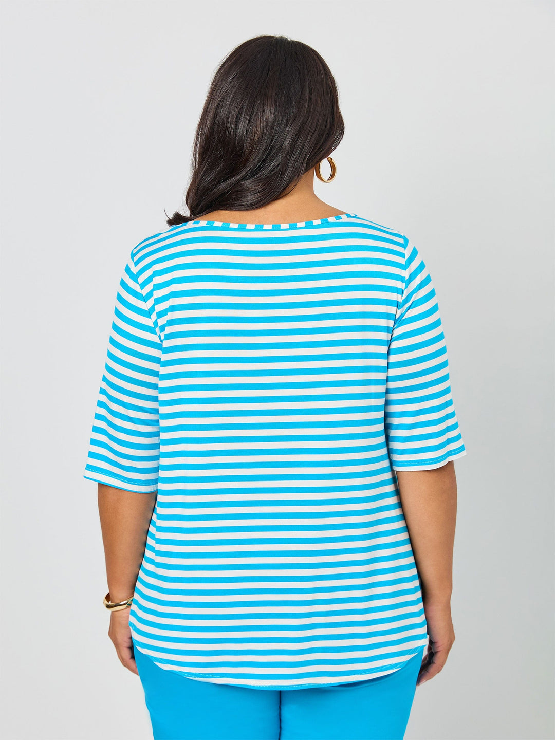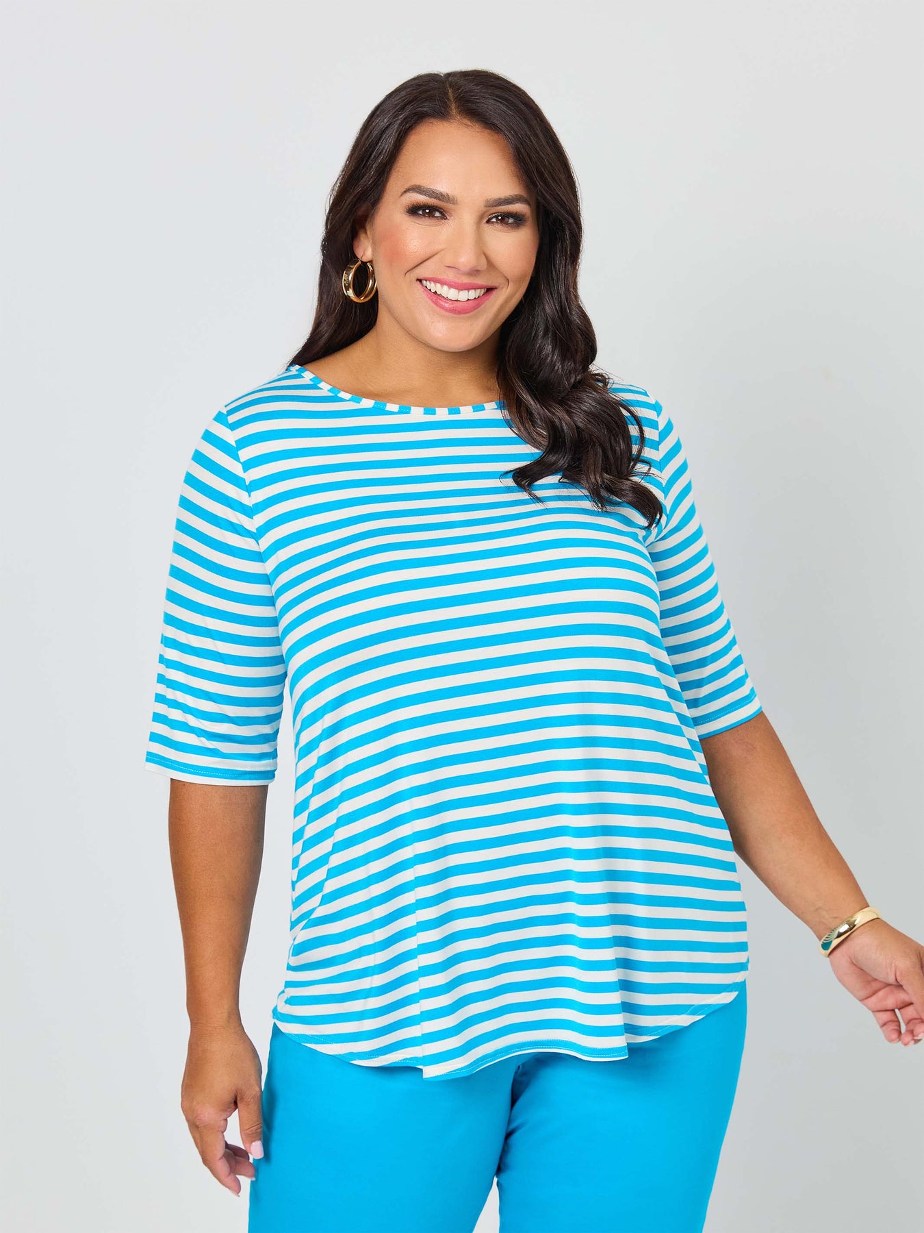 - Details: Upper forearm length sleeves, scooped neck and hemline, fresh turqouise and white stripe, quality tee shirt style stretch fabric