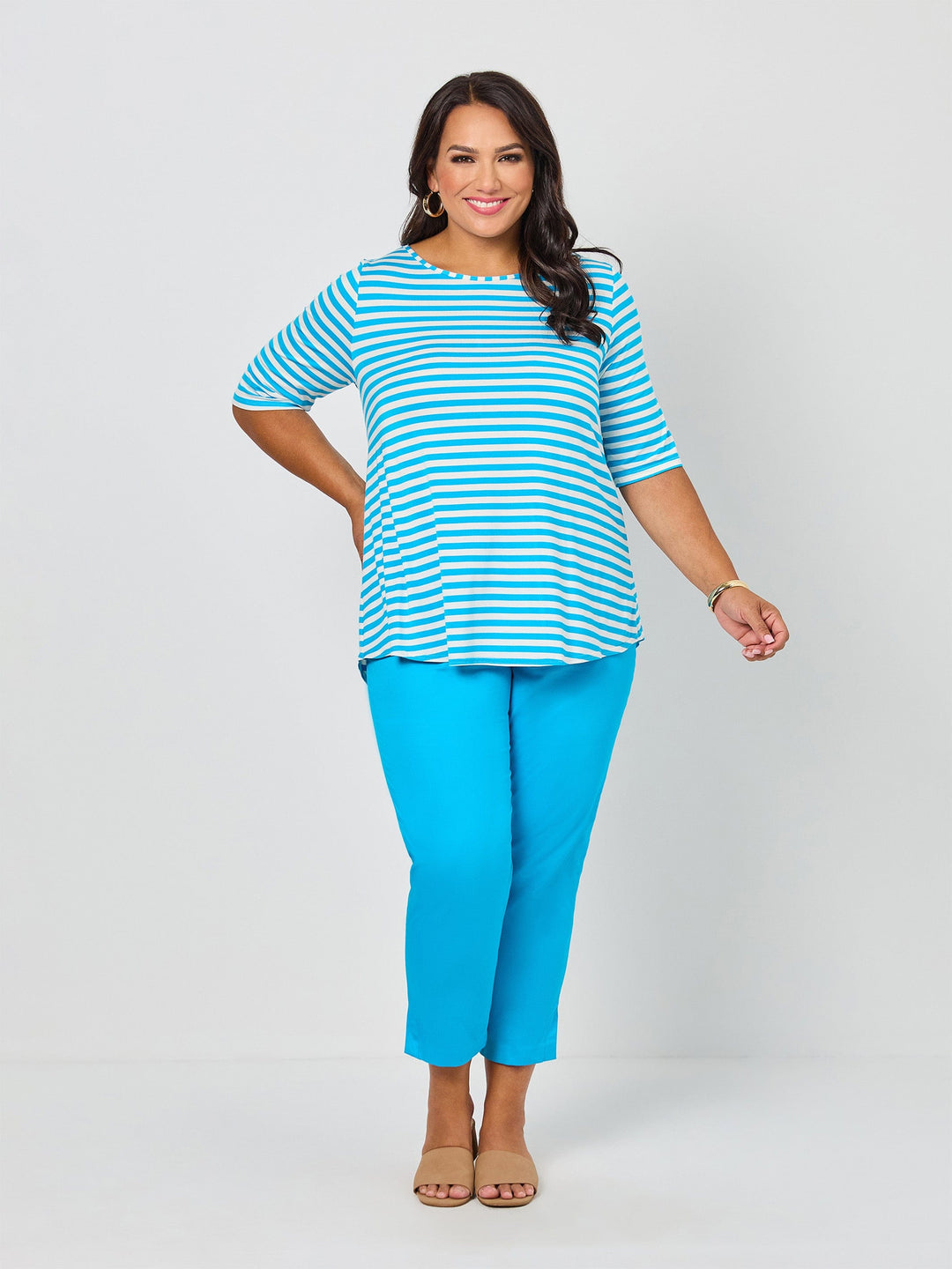 Always a fresh and summery choice, this plus size striped tee brings together casual comfort and understated elegance. The classic stripe adds a timeless touch, while the relaxed fit ensures all-day ease and versatility. Perfect for weekend outings, lunch with friends, or running errands in style. Pair it with white stretch Bengaline or cotton sateen pants to complete a crisp, effortlessly put-together look that feels as good as it looks.